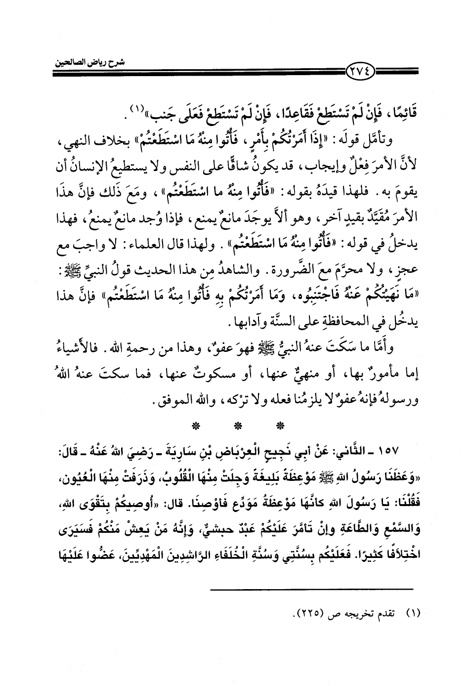 157ـ الثاني: عن أبي نجيح العرباض بن سارية ـ رضي الله عنه ـ قال: (وعظنا رسول الله صلى الله عليه وسلم موعظة بليغة وجلت منها القلوب، وذرفت منها العيون، فقلنا: يا رسول الله كأنها موعظة مودع فأوصنا. قال: (أوصيكم بتقوى الله. والسمع والطاعة وإن تأمر عليكم عبد حبشي، وإنه من يعش منكم فسيرى اختلافاً كثيراً. فعليكم بسنتي وسنة الخلفاء الراشدين المهديين، عضوا عليها