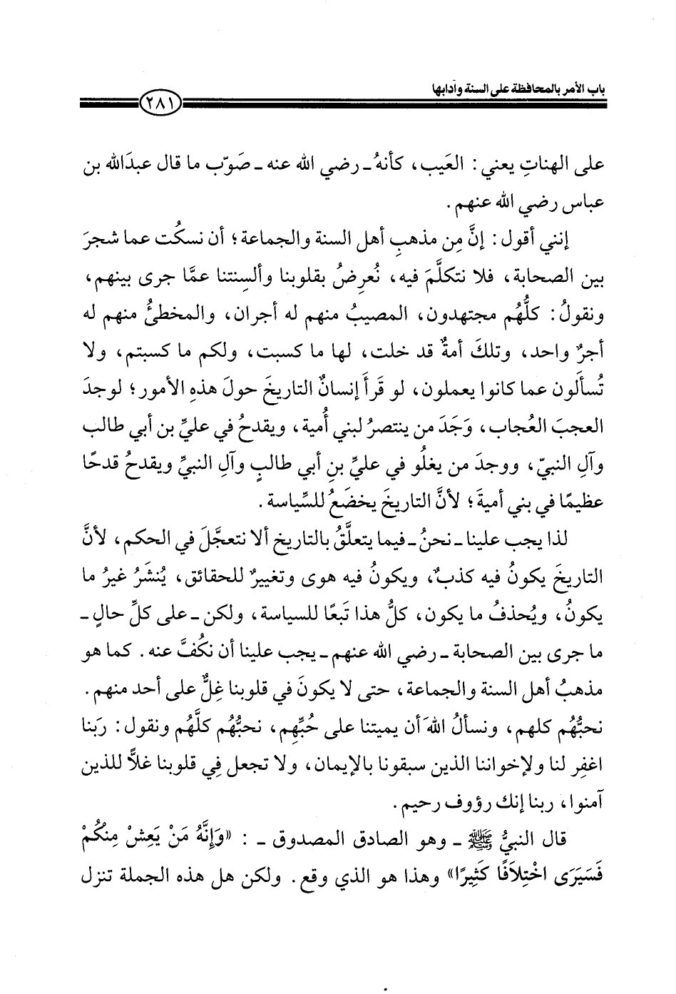 لذا يجب علينا ـ نحن ـ فيما يتعلق بالتاريخ ألا نتعجل في الحكم، لأن التاريخ يكون فيه كذب، ويكون فيه هوى وتغيير للحقائق، ينشر غير ما يكون، ويحذف ما يكون، كل هذا تبعاً للسياسة، ولكن ـ على كل حال ـ ما جرى بين الصحابة ـ رضي الله عنهم ـ يجب علينا أن نكف عنه. كما هو مذهب أهل السنة والجماعة، حتى لا يكون في قلوبنا غل على أحد منهم. نحبهم كلهم، ونسأل الله أن يميتنا على حبهم، نحبهم كلهم ونقول: ربنا اغفر لنا ولإخواننا الذين سبقونا بالإيمان، ولا تجعل في قلوبنا غلاً للذين آمنوا، ربنا إنك رؤوف رحيم.