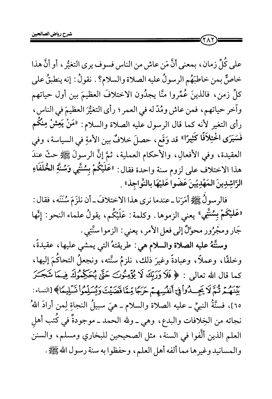 وسنته عليه الصلاة والسلام هي: طريقته التي يمشي عليها، عقيدة، وخلقاً، وعملاً، وعبادةً وغير ذلك، نلزم سنته، ونجعل التحاكم إليها، كما قال الله تعالى: (فَلا وَرَبِّكَ لا يُؤْمِنُونَ حَتَّى يُحَكِّمُوكَ فِيمَا شَجَرَ بَيْنَهُمْ ثُمَّ لا يَجِدُوا فِي أَنْفُسِهِمْ حَرَجاً مِمَّا قَضَيْتَ وَيُسَلِّمُوا تَسْلِيماً) (النساء: 65) ، فسنة النبي ـ عليه الصلاة والسلام ـ هي سبيل النجاة لمن أراد الله نجاته من الخلافات والبدع، وهي ـ ولله الحمد ـ موجودة في كتب أهل العلم الذين ألفوا في السنة، مثل الصحيحين للبخاري ومسلم، والسنن والمسانيد وغيرها مما ألفه أهل العلم وحفظوا به سنة رسول الله صلى الله عليه وسلم.