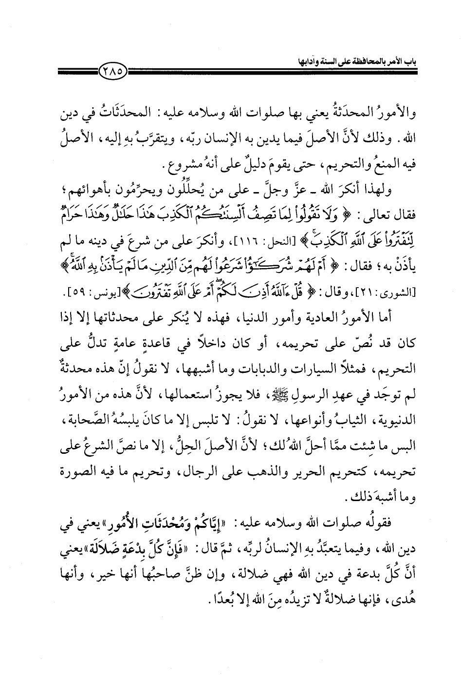 ولهذا أنكر الله ـ عز وجل ـ على من يحللون ويحرمون بأهوائهم؛ فقال تعالى: (وَلا تَقُولُوا لِمَا تَصِفُ أَلْسِنَتُكُمُ الْكَذِبَ هَذَا حَلالٌ وَهَذَا حَرَامٌ لِتَفْتَرُوا عَلَى اللَّهِ الْكَذِبَ) (النحل: من الآية116) ، وأنكر على من شرع في دينه ما لم يأذن به؛ فقال: (أَمْ لَهُمْ شُرَكَاءُ شَرَعُوا لَهُمْ مِنَ الدِّينِ مَا لَمْ يَأْذَنْ بِهِ اللَّهُ) (الشورى: من الآية21) ، وقال (قُلْ آللَّهُ أَذِنَ لَكُمْ أَمْ عَلَى اللَّهِ تَفْتَرُونَ) (يونس: من الآية59) .