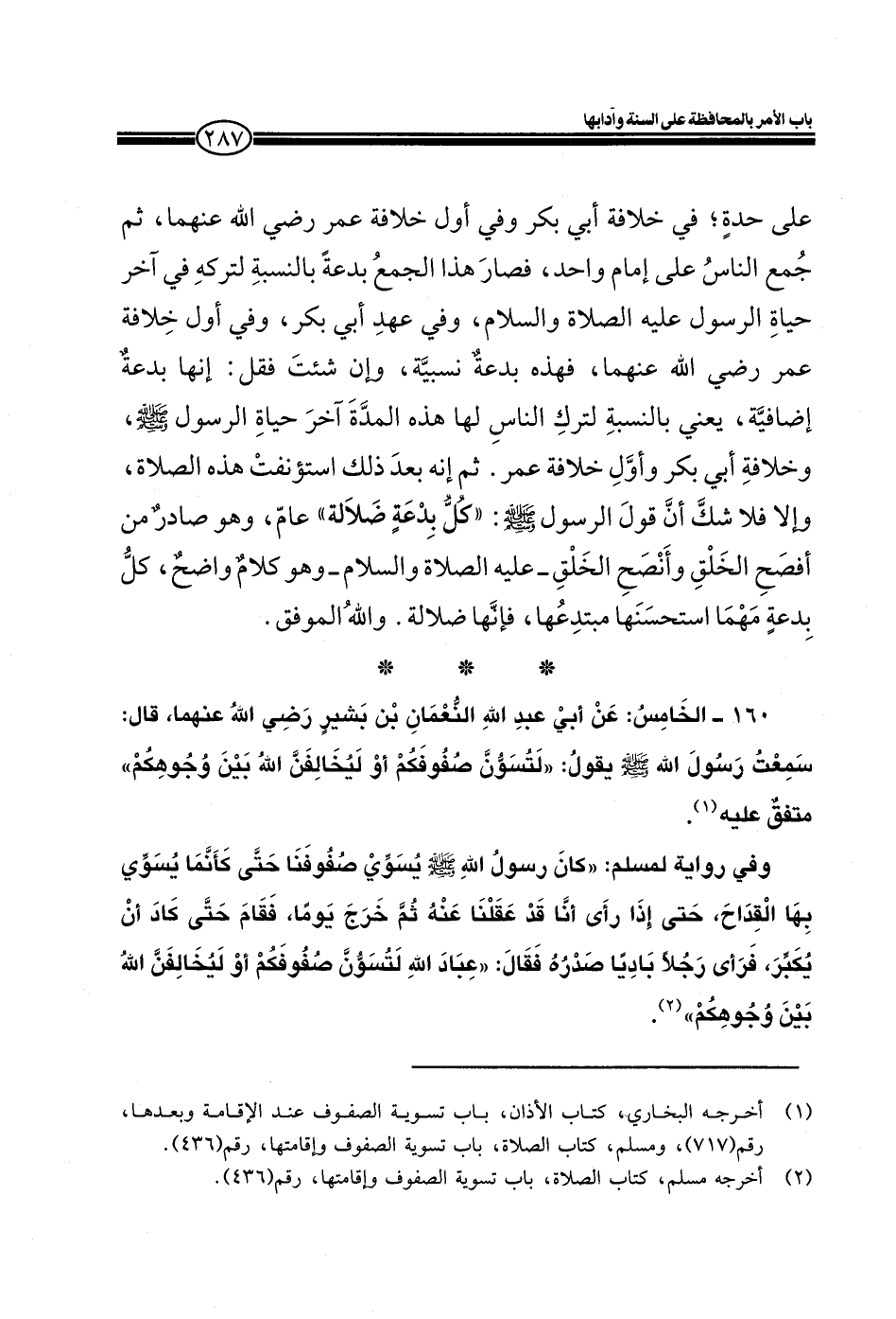 160ـ الخامس: عن أبي عبد الله النعمان بن بشير رضي الله عنهما، قال: سمعت رسول الله صلى الله عليه وسلم يقول: (لتسون صفوفكم أو ليخالفن الله بين وجوهكم) متفق عليه.