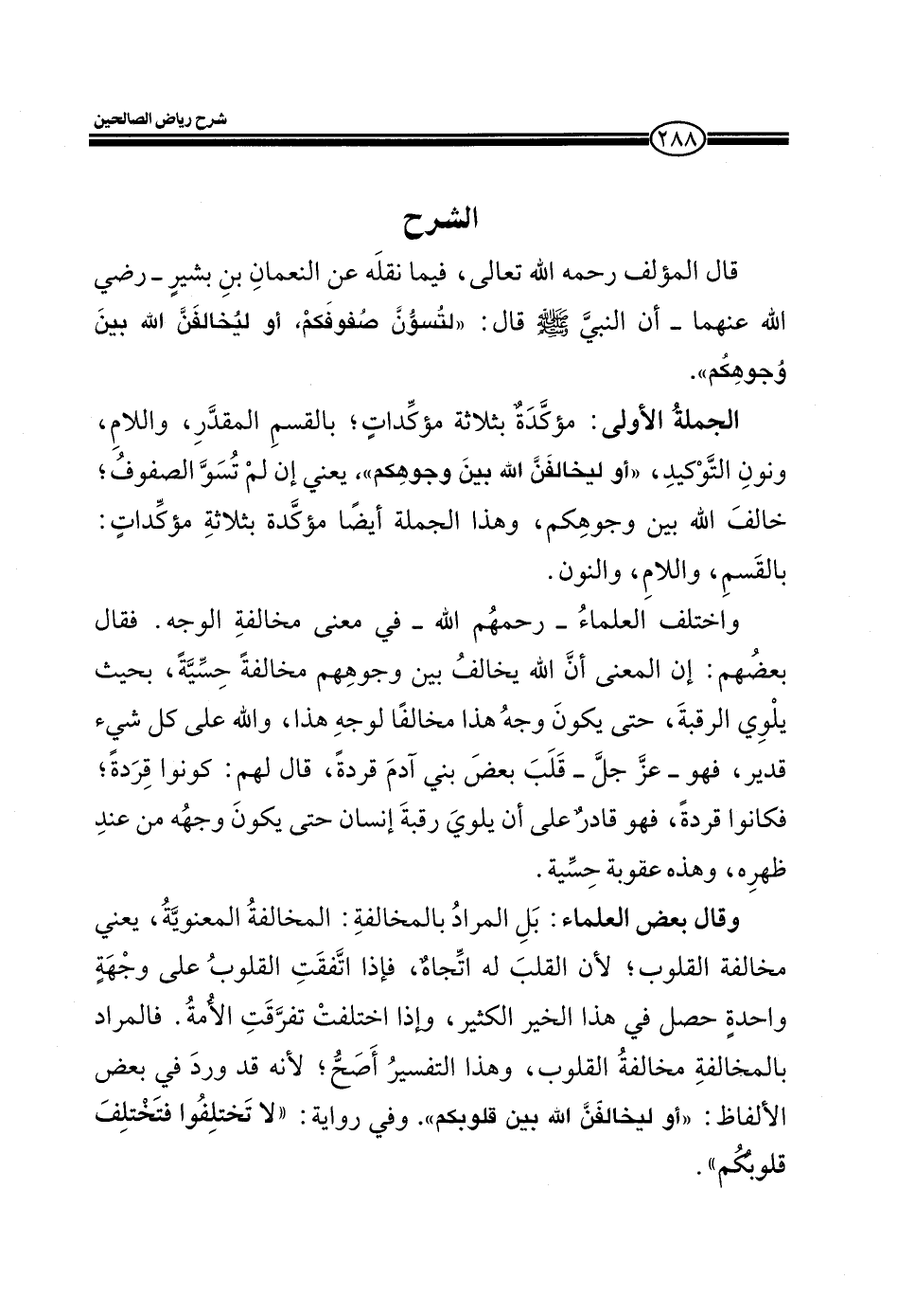 EXقال المؤلف رحمة الله تعالى، فيما نقله عن النعمان بن بشير ـ رضي الله عنهما ـ أن النبي صلى الله عليه وسلم قال: (لتسون صفوفكم، أو ليخالفن الله بين وجوهكم) .