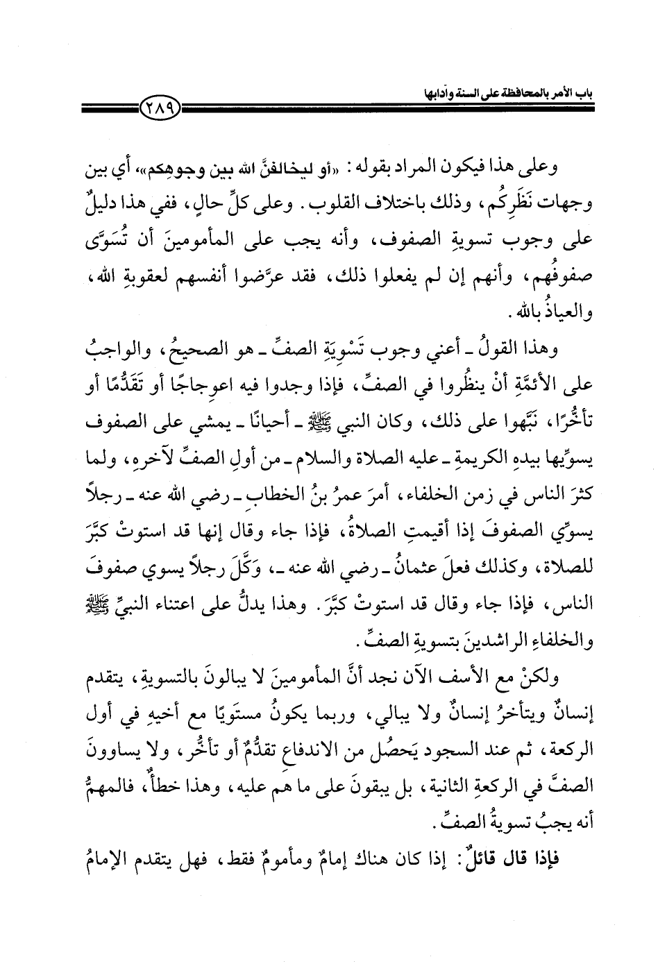 وهذا القول ـ أعني وجوب تسوية الصف ـ هو الصحيح، والواجب على الأئمة أن ينظروا في الصف، فإذا وجدوا فيه اعوجاجاً أو تقدماً أو تأخراً، نبهوا على ذلك، وكان النبي صلى الله عليه وسلم ـ أحياناً -يمشي على الصفوف يسويها بيده الكريمة ـ عليه الصلاة والسلام ـ، من أول الصف لآخره، ولما كثر الناس في زمن الخلفاء، أمر عمر بين الخطاب ـ رضي الله عنه ـ رجلاً يسوي الصفوف إذا أقيمت الصلاة، فإذا جاء وقال إنها قد سويت كبر للصلاة، وكذلك فعل عثمان ـ رضي الله عنه ـ، وكل رجلاً يسوي صفوف الناس، فإذا جاء وقال قد استوت كبر. وهذا يدل على اعتناء النبي صلى الله عليه وسلم والخلفاء الراشدين بتسوية الصف.