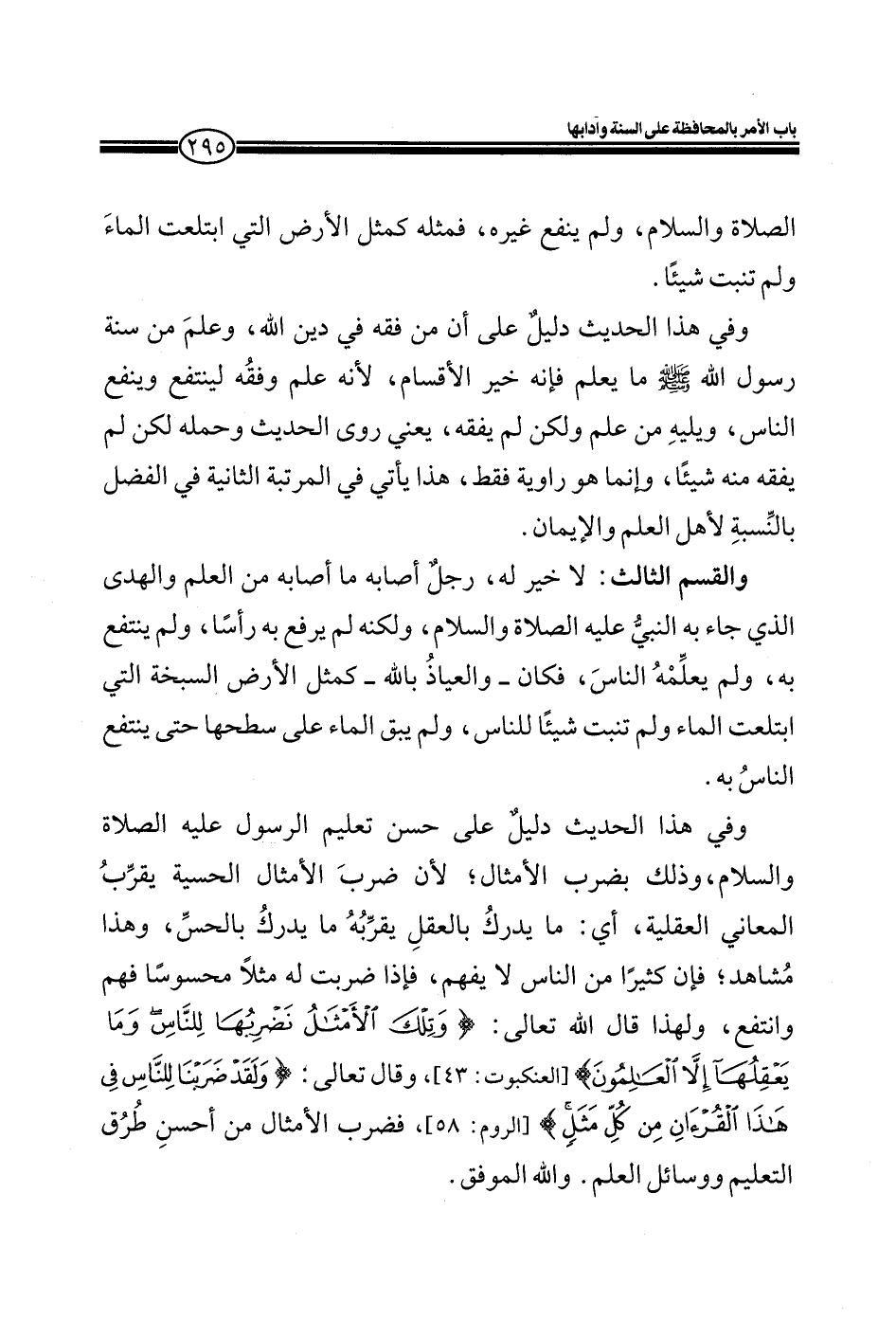 وفي هذا الحديث دليل على حسن تعليم الرسول عليه الصلاة والسلام، ذلك بضرب الأمثال لأن ضرب الأمثال الحسية يقرب المعاني العقلية أي: ما يدرك بالعقل يقربه ما يرك بالحس، وهذا مشاهد؛ فإن كثيراً من الناس لا يفهم، فإذا ضربت له مثلاً محسوساً فهم وانتفع، ولهذا قال الله تعالى: (وَتِلْكَ الْأَمْثَالُ نَضْرِبُهَا لِلنَّاسِ وَمَا يَعْقِلُهَا إِلَّا الْعَالِمُونَ) (العنكبوت: 43) وقال تعالى: (وَلَقَدْ ضَرَبْنَا لِلنَّاسِ فِي هَذَا الْقُرْآنِ مِنْ كُلِّ مَثَلٍ) (الروم: 58) فضرب الأمثال من أحسن طرق التعليم ووسائل العلم. والله الموفق.