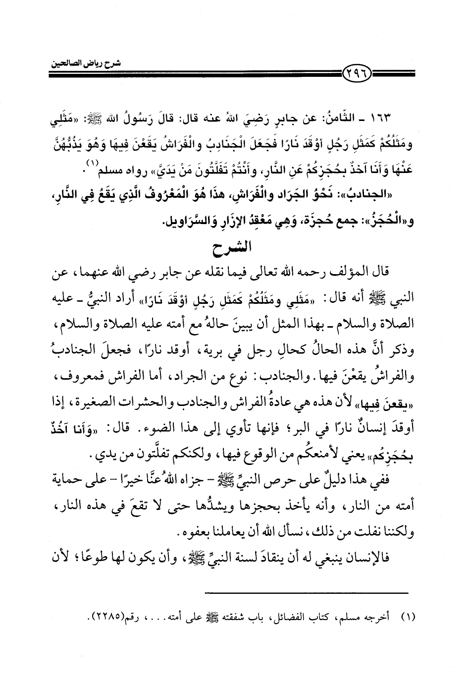 EXقال المؤلف رحمه الله تعالى فيما نقله عن جابر رضي الله عنهما، عن النبي صلى الله عليه وسلم أنه قال: (مثلي ومثلكم كمثل رجل أوقد ناراً) أراد النبي ـ عليه الصلاة والسلام ـ بهذا المثل أن يبين حاله مع أمته عليه الصلاة والسلام، وذكر أن هذه الحال كحال رجل في برية، أوقد ناراً، فجعل الجنادب والفراش يقعن فيها. والجنادب: نزع من الجراد، أما الفراش فمعروف، (يقعن فيها) لأن هذه هي عادة الفراش والجنادب والحشرات الصغيرة، إذا أوقد إنسان ناراً في البر؛ فإنها تأوي إلى هذا الضوء. قال: (وأنا آخذ بحجزكم) يعني لأمنعكم من الوقوع فيها، ولكنكم تفلتون من يدي.