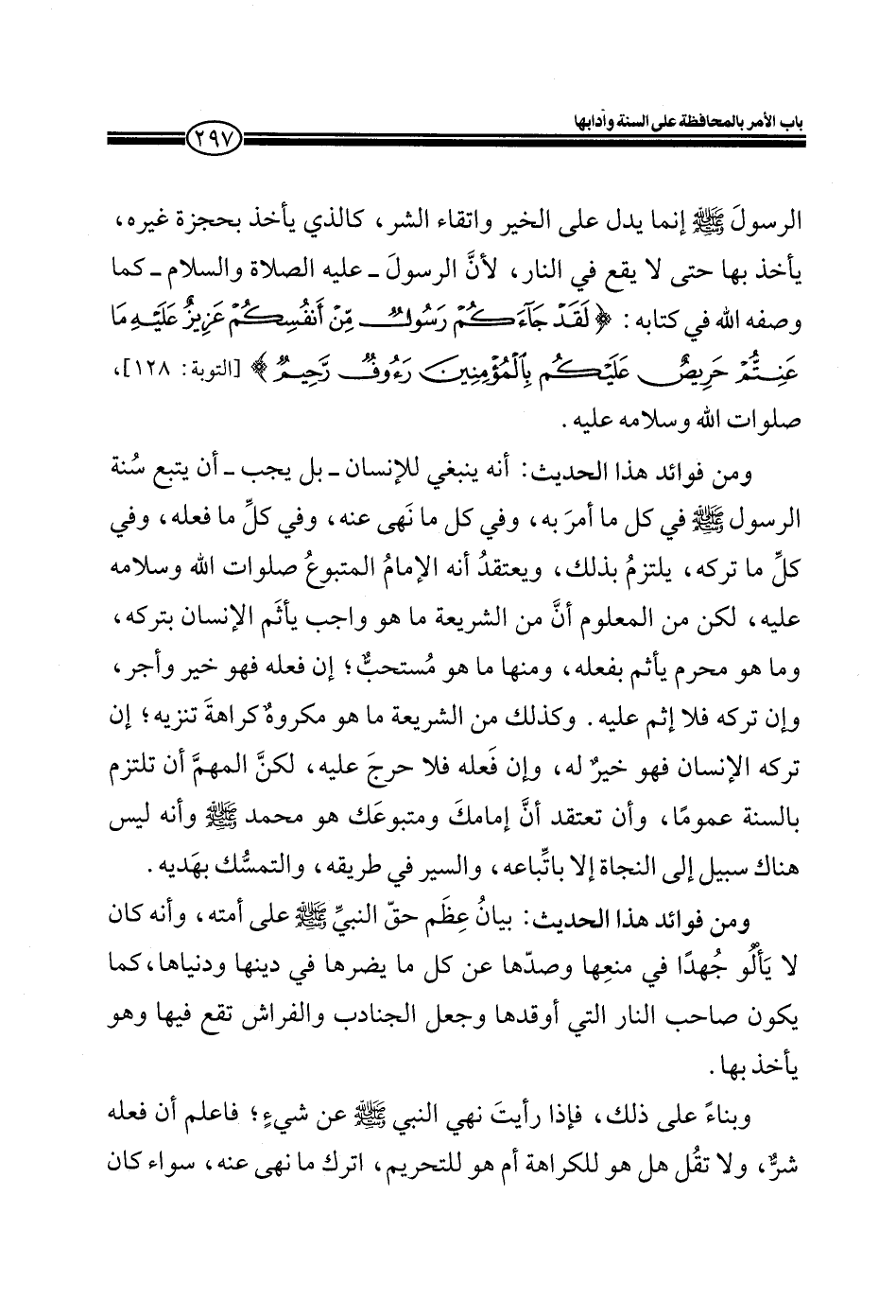 ومن فوائد هذا الحديث: أنه ينبغي للإنسان ـ بل يجب ـ أن يتبع سنة الرسول صلى الله عليه وسلم في كل ما أمر به، وفي كل ما نهى عنه، وفي كل ما فعله، وفي كل ما تركه، يلتزم بذلك، ويعتقد أنه الإمام المتبوع صلوات الله وسلامه عليه، لكن من المعلوم أن من الشريعة ما هو واجب يأثم الإنسان بتركه، وما هو محرم يأثم بفعله، ومنها ما هو مستحب؛ إن فعله فهو خير وأجر، وأن تركه فلا أثم عليه. وكذلك من الشريعة ما هو مكروه كراهة تنزيه؛ إن تركه الإنسان فهو خير له، وإن فعله فلا حرج عليه، لكن المهم أن تلتزم بالسنة عموماً، وأن تعتقد أن أمامك ومتبوعك هو محمد صلى الله عليه وسلم وأنه ليس هناك سبيل إلى النجاة إلا باتباعه، والسير في طريقه، والتمسك بهديه.