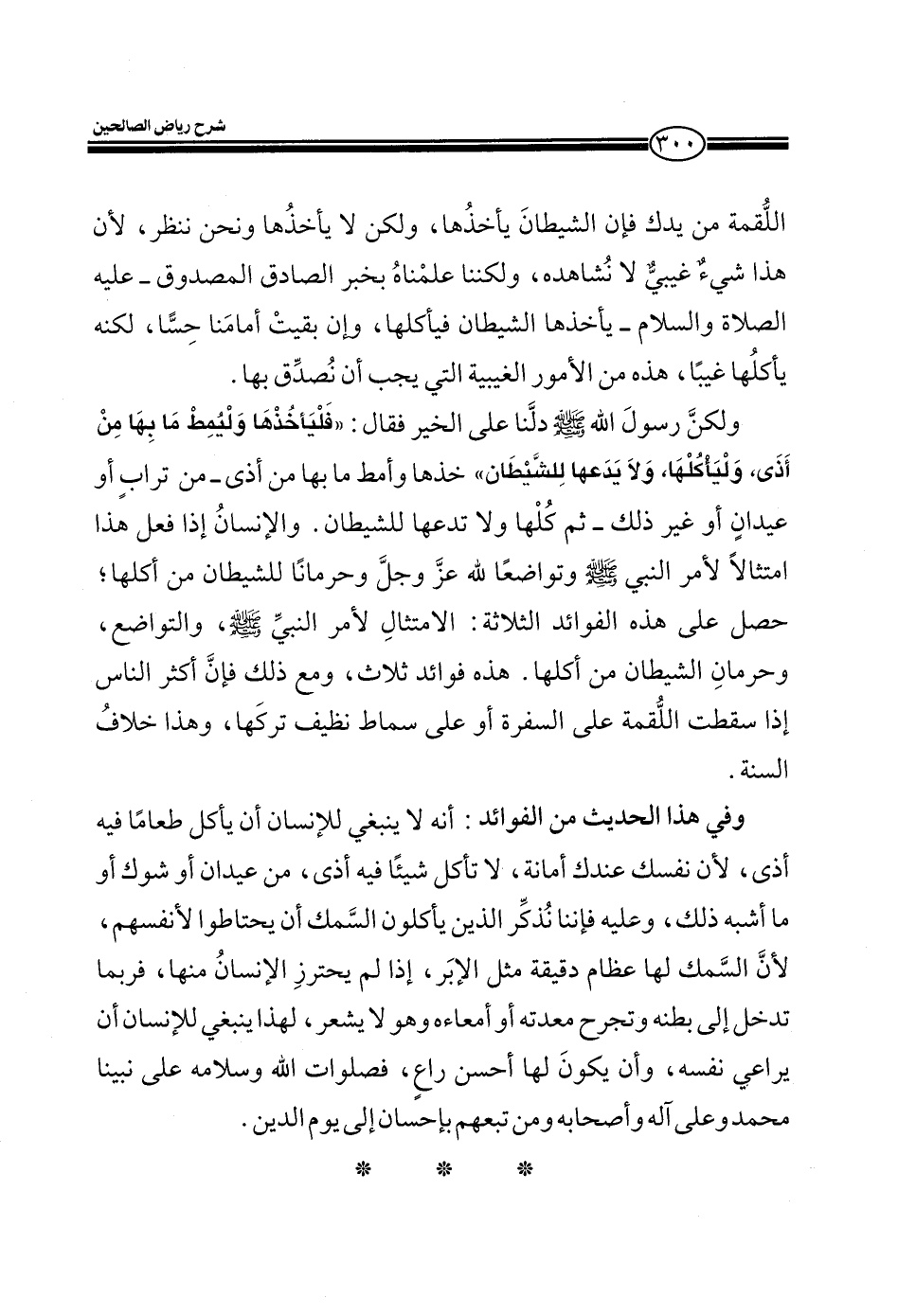 وفي هذا الحديث من الفوائد: أنه لا ينبغي للإنسان أن يكل طعاماً فيه أذى، لأن نفسك عندك أمانة، لا تأكل شيئاً فيه أذى، من عيدان أو شوك أو ما أشبه ذلك، وعليه فإننا نذكر الذين يأكلون السمك أن يحتاطوا لأنفسهم، لأن السمك لها عظام دقيقة مثل الإبر، إذا لم يحترز الإنسان منها، فربما تخل إلى بطنه وتجرح معدته أو أمعاءه وهو لا يشعر، لهذا ينبغي للإنسان أن يراعي نفسه، وأن يكون لها أحسن راع، فصلوات الله وسلامه على نبينا محمد وعلى آله وأصحابه ومن تبعهم بإحسان إلى يوم الدين.