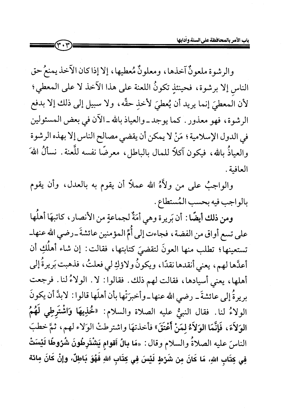 ومن ذلك أيضاً: أن بريرة وهي أمة لجماعة من الأنصار، كاتبها أهلها على تسع أوراق من الفضة، فجاءت إلى أم المؤمنين عائشة ـ رضي الله عنها ـ تستعينها؛ تطلب منها العون لتقضي كتابتها، فقالت: إن شاء أهلك أن أعدها لهم، يعني أنقدها نقداً، ويكون ولاؤك لي فعلت، فذهبت بريرة إلى أهلها، يعني أسيادها، فقالت لهم ذلك. فقالوا: لا. الولاء لنا. فرجعت بريرة إلى عائشة ـ رضي الله عنها ـ وأخبرتها بأن أهلها قالوا: لابد أن يكون الولاء لنا. فقال النبي عليه الصلاة والسلام: (خذيها واشترطي لهم الولاء، فإنما الولاء لمن أعتق) فأخذتها واشترطت الولاء لهم، ثم خطب الناس عليه الصلاة والسلام وقال: (ما بال أقوام يشترطون شروطاً ليست في كتاب الله، ما كان من شرط ليس في كتاب الله فهو باطل، وإن كان مائة
