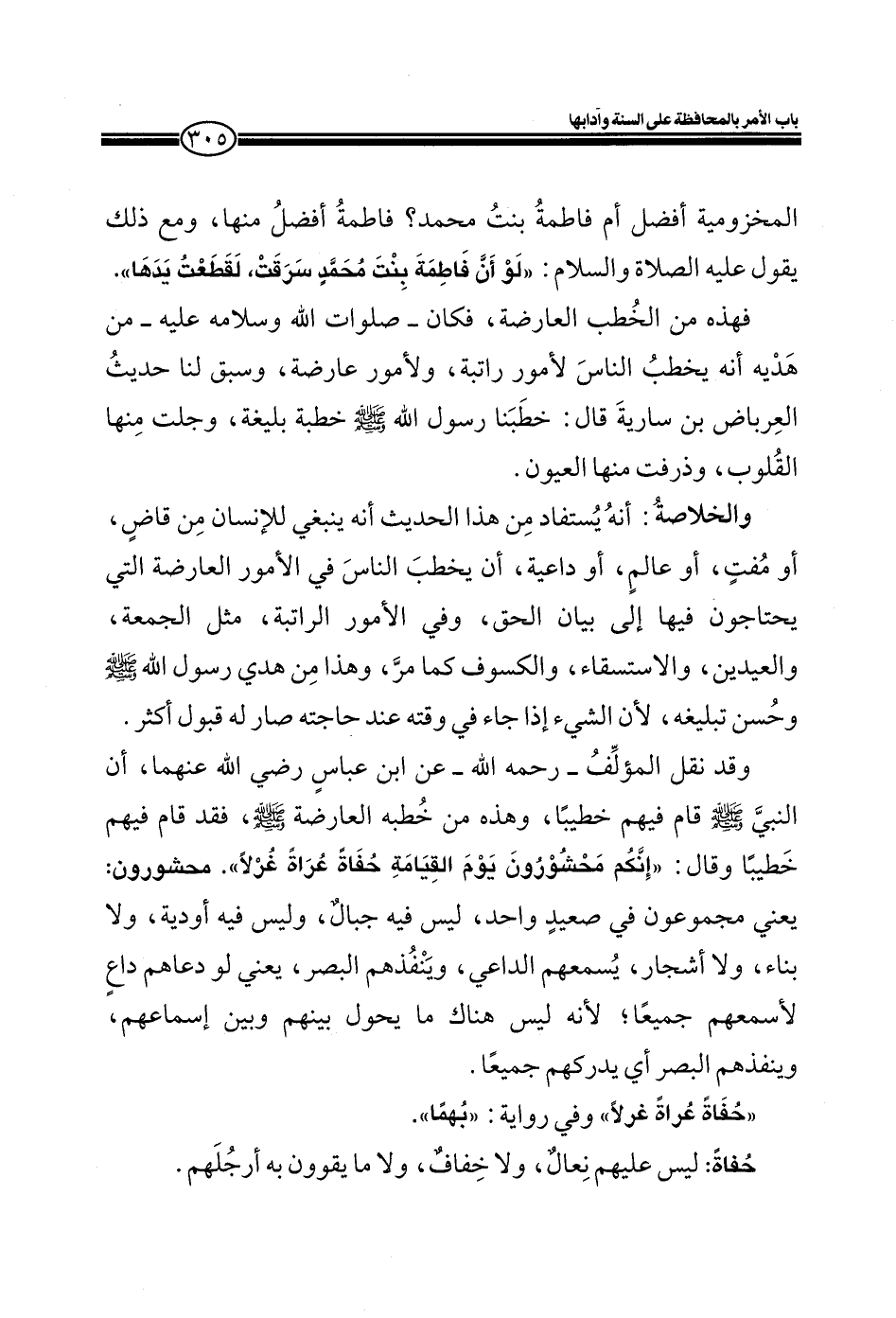 وقد نقل المؤلف ـ رحمة الله ـ عن أبن عباس رضي الله عنهما، أن النبي صلى الله عليه وسلم قام فيهم خطيباً، وهذه من خطبه العارضة صلى الله عليه وسلم، فقد قام فيهم خطيباً وقال: (إنكم محشورون يوم القيامة حفاة عراة غرلاً) . محشورون: يعنى مجمعون في صعيد واحد النبي صلي الله عليه وسلم ليس فيه جبال، وليس فيه أودية، ولا بناء، ولا أشجار، يسمعهم الداعي، وينفذهم البصر، يعني لو دعاهم داع لأسمعهم جميعاً؛ لأنه ليس هناك ما يحول بينهم وبين إسماعهم وينفذهم البصر أي يدركهم جميعاً.