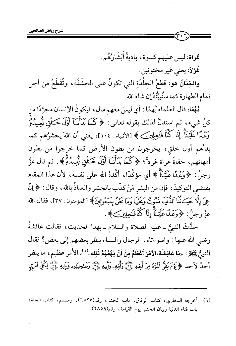 بهماً: قال العلماء بهماً: أي ليس معهم مال، فيكون الإنسان مجرداً من كل شيء، ثم استدل لذلك بقوله تعالى (كَمَا بَدَأْنَا أَوَّلَ خَلْقٍ نُعِيدُهُ وَعْداً عَلَيْنَا إِنَّا كُنَّا فَاعِلِينَ) (الأنبياء: من الآية104) ، يعني أن الله يحشرهم كما بدأهم أول خلق، يخرجون من بطون الأرض كما خرجوا من بطون أمهاتهم، حفاة عراة غرلاً؛ (كَمَا بَدَأْنَا أَوَّلَ خَلْقٍ نُعِيدُهُ) . ثم قال عز وجل: (وَعْداً عَلَيْنَا) أي مؤكداً، أكده الله على نفسه، لأن هذا المقام يقضي التوكيد، فإن من البشر من كذب بالحشر والعياذ بالله، وقال: (إِنْ هِيَ إِلَّا حَيَاتُنَا الدُّنْيَا نَمُوتُ وَنَحْيَا وَمَا نَحْنُ بِمَبْعُوثِينَ) (المؤمنون: 37) ، فقال عز وجل: (وَعْداً عَلَيْنَا إِنَّا كُنَّا فَاعِلِينَ) .