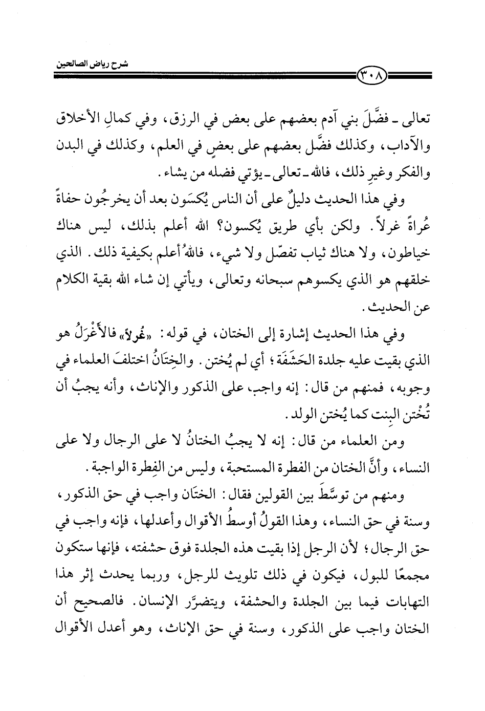 وفي هذا الحديث إشارة إلى الختان، في قوله: (غرلاً) فالأغرل هو الذي بقيت عليه جلدة الحشفة؛ أي لم يختن. والختان اختلف العلماء في وجوبه، فمنهم من قال: إنه واجب على الذكور والإناث، وأنه يجب أن تختن البنت كما يختن الولد.