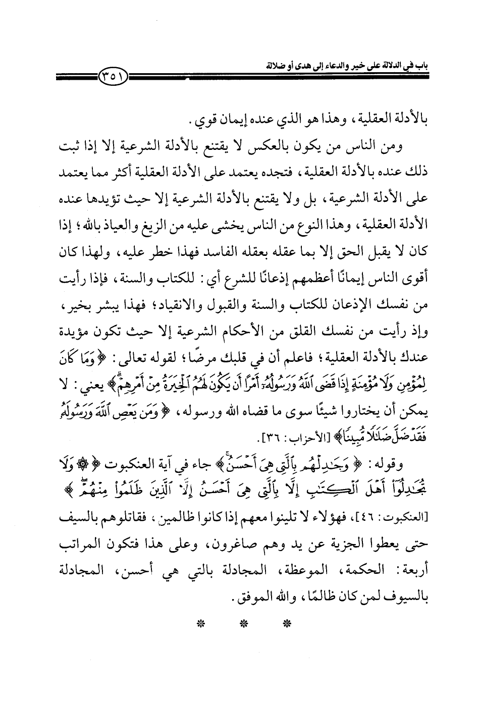 ومن الناس من يكون بالعكس لا يقتنع بالأدلة الشرعية إلا إذا ثبت ذلك عنده بالأدلة العقلية، فتجده يعتمد على الأدلة العقلية أكثر مما يعتمد على الأدلة الشرعية، بل ولا يقتنع بالأدلة الشرعية إي حيث تؤيدها عنده الأدلة العقلية، وهذا النوع من الناس يخشى عليه من الزيغ والعياذ بالله؛ إذا كان لا يقبل الحق إلا بما عقله بعقله الفاسد فهذا خطر عليه، ولهذا كان أقوى الناس إيماناً أعظمهم إذعاناً للشرع أي: للكتاب والسنة، فإذا رأيت من نفسك الإذعان للكتاب والسنة والقبول والاقتياد؛ فهذا يبشر بخير، وإذ رأيت من نفسك القلق من الأحكام الشرعية إلا حيث تكون مؤيدة عنك بالأدلة العقلية؛ فاعلم أن في قلبك مرضاً؛ لقوله تعالى: (وَمَا كَانَ لِمُؤْمِنٍ وَلا مُؤْمِنَةٍ إِذَا قَضَى اللَّهُ وَرَسُولُهُ أَمْراً أَنْ يَكُونَ لَهُمُ الْخِيَرَةُ مِنْ أَمْرِهِمْ) يعني: لا يمكن أن يختاروا شيئاً سوى ما قضاه الله ورسوله، (وَمَنْ يَعْصِ اللَّهَ وَرَسُولَهُ فَقَدْ ضَلَّ ضَلالاً مُبِيناً) (الأحزاب: 36) .