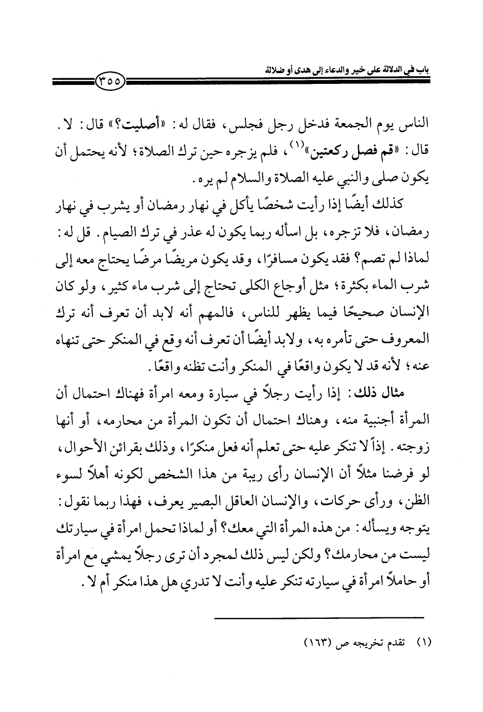 كذلك أيضاً إذا رأيت شخصاً يأكل في نهار رمضان أو يشرب في نهار رمضان فلا تزجره، بل اسأله ربما يكون له عذر في ترك الصيام. قل له لماذا لم تصم؟ فقد يكون مسافراً، وقد يكون مريضاً مرضاً يحتاج معه إلى شرب الماء بكثرة؛ مثل أوجاع الكلى تحتاج إلى شرب ماء كثير، ولو كان الإنسان صحيحاً فيما يظهر للناس، فالمهم أنه لابد أن تعرف أنه ترك المعروف حتى تأمره به، ولا بد أيضاً أن تعرف انه وقع في المنكر حتى تنهاه عنه؛ لأنه قد لا يكون واقعاً في المنكر وأنت تظنه واقعاً.