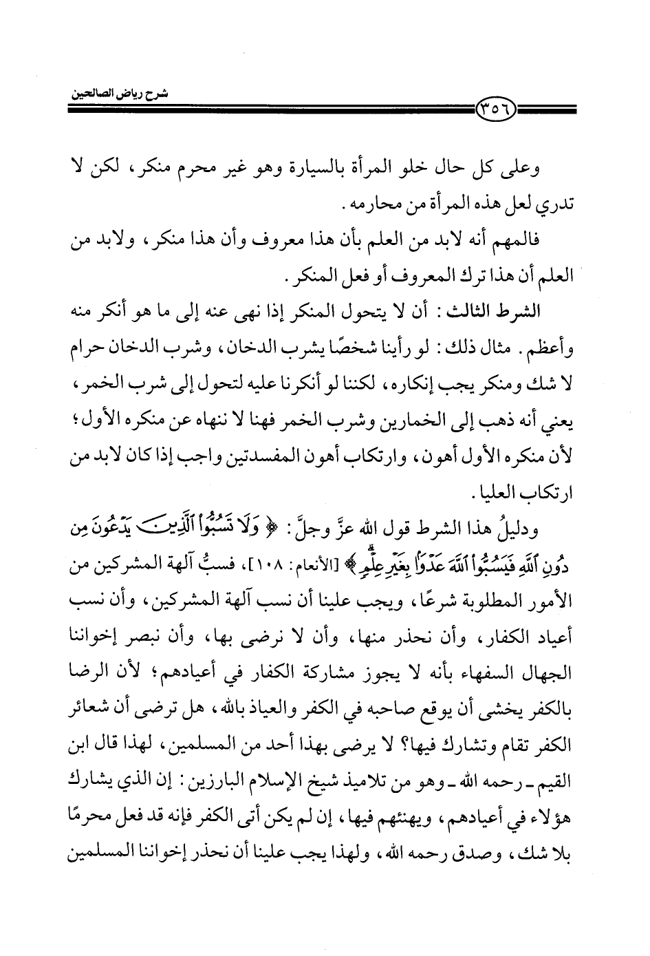 ودليلُ هذا الشرط قول الله عز وجلّ: فسبُ آلهة المشركين من الأمور المطلوبة شرعاً، ويجب علينا أن نسب آلهة المشركين، وأن نسب أعياد الكفار، وأن نحذر منها، وأن لا نرضى بها، وأن نبصر إخواننا الجهال السفهاء بأنه لا يجوز مشاركة الكفار في أعيادهم؛ لأن الرضا بالكفر يخشى أن يوقع صاحبه في الكفر والعياذ بالله، هل ترضى أن شعائر الكفر تقام وتشارك فيها؟ لا يرضى بهذا أحد من المسلمين، لهذا قال ابن القيم - رحمه الله- وهو من تلاميذ شيخ الإسلام البارزين: إن الذي يشارك هؤلاء في أعيادهم ويهنئهم فيها، إن لم يكن أتى الكفر فإنه قد فعل محرماً بلا شك، وصدق رحمه الله، ولهذا يجب علينا أن نحذر إخواننا المسلمين
