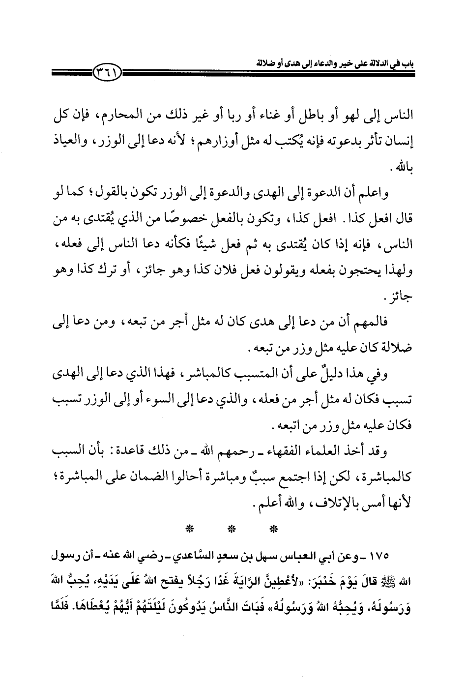 175- وعن أبي العباس سهل بن سعدٍ الساعدي- رضي الله عنه- أن رسول الله صلى الله عليه وسلم قال يوم خيبر: " لاُعطين الراية غداً رجلاً يفتح الله في يديه، يحبُ الله ورسوله، ويحبه الله ورسولهُ" فبات الناسُ يدوكُون ليلتهم أيهم يعطاها، فلما