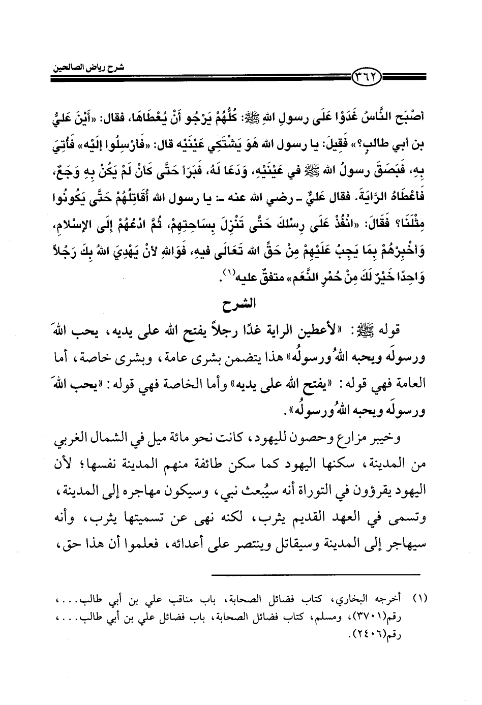 EXقوله صلى الله عليه وسلم: " لأعطين الراية غداً رجلاً يفتح الله على يديه، يحب الله ورسوله ويحبه الله ورسولهُ" هذا يتضمن بشرى عامة، وبشرى خاصة، أما العامة فهي قوله: " يفتح اله على يديه" وأما الخاصة فهي قوله: " يجب الله ورسولَه ويحبه اللهُ ورسولُه".