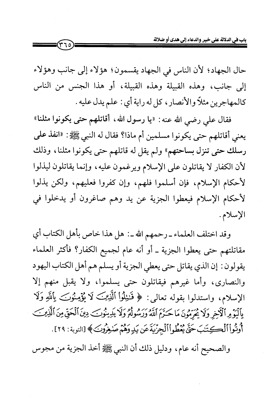 فقال علي رضي الله عنه " يا رسول الله أقاتلهم حتى يكونوا مثلنا" يعني أقاتلهم حتى يكونوا مسلمين أم ماذا فقال له النبي صلى الله عليه وسلم: " انفذ على رسلك حتى تنزل بساحتهم" ومل يقل له قاتلهم حتى يكونوا مثلنا، وذلك لأن الكفار لا يقاتلون على الإسلام ويرغمون عليه، وإنما يقاتلون ليذلوا لأحكام الإسلام فيعطوا الجزية عن يد وهم صاغرون أو يدخلوا في الإسلام.