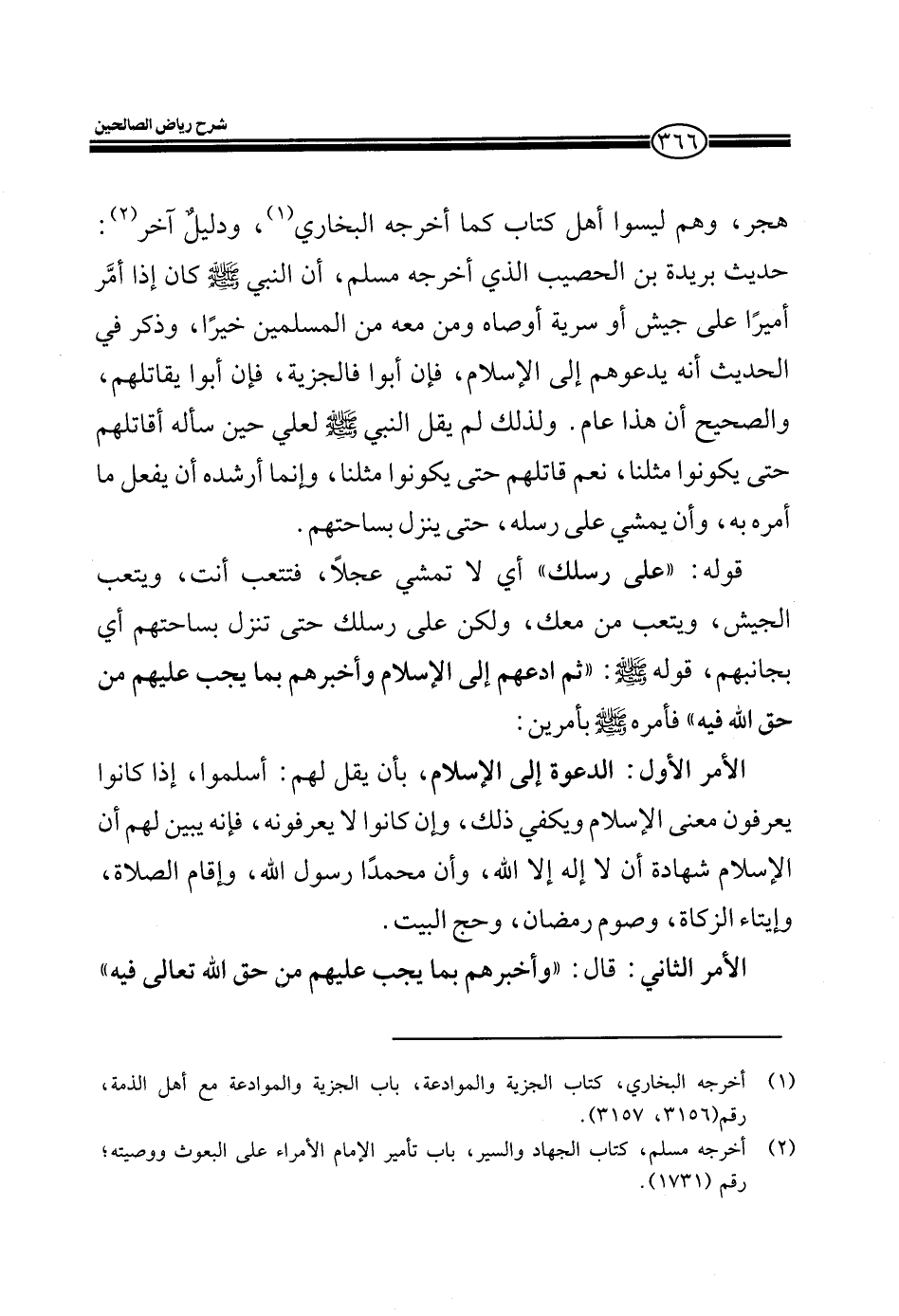 هجر، وهم ليسوا أهل كتاب كما أخرجه البخاري، ودليلٌ آخر: حديث بريدة بن الحصيب الذي أخرجه مسلم، أن النبي صلى الله عليه وسلم كان إذا أمر أميراً على جيش أو سرية أوصاه ومن معه من المسلمين خيراً وذر في الحديث ا، هـ يدعوهم إلى الإسلام، فإن أبوا فالجزية فإن أبوا يقاتلهم والصحيح أن هذا عام. ولذلك لم يقل النبي صلى الله عليه وسلم لعلي حين سأله أقاتلهم حتى يكونوا مثلنا، نعم قاتلهم حتى يكونوا مثلنا، وإنما أرشده أن يفعل ما أمره به، وأن يمشي على رسله، حتى ينزل بساحتهم.