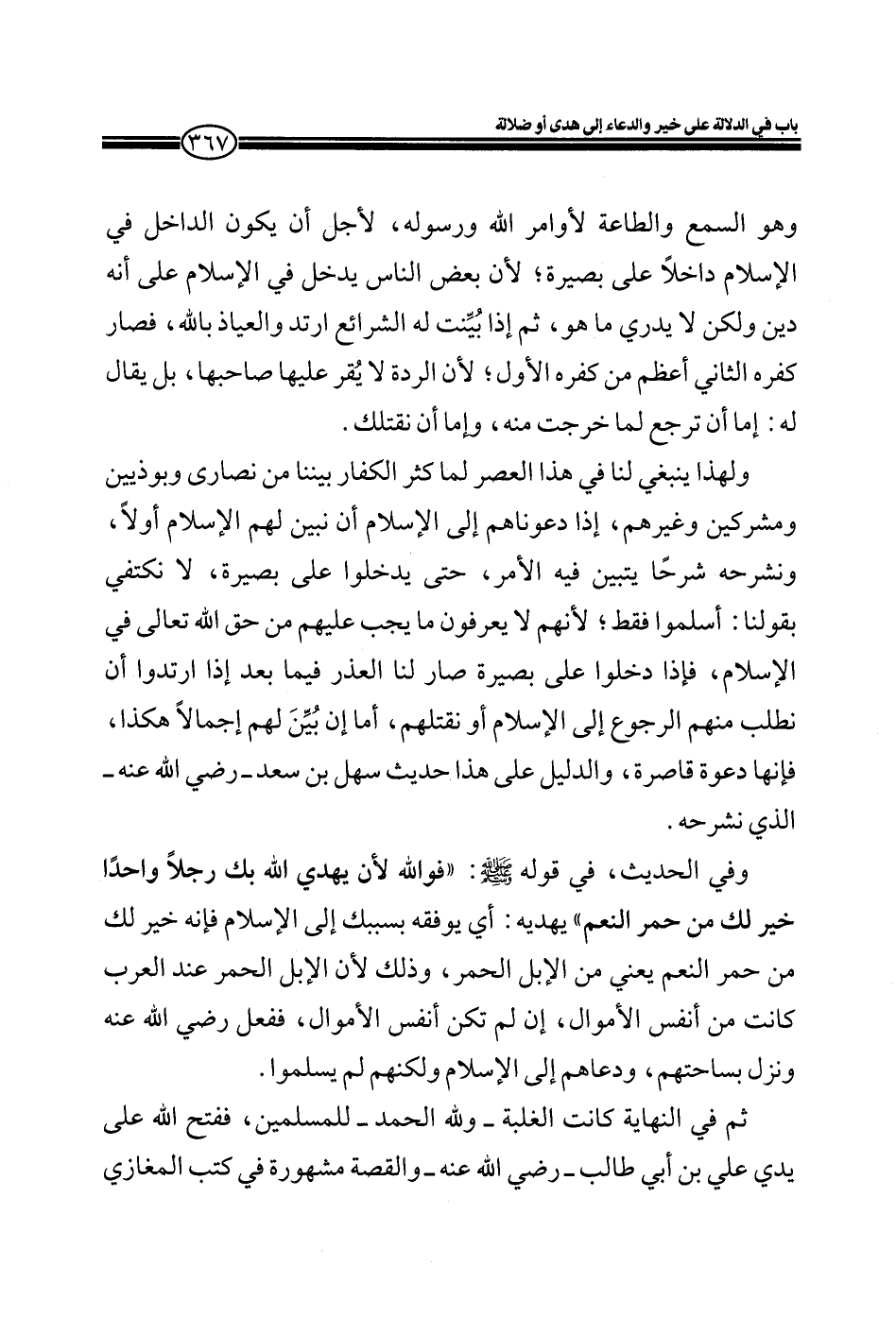ولهذا ينبغي لنا في هذا العصر لما كثر الكفار بيننا من نصارى وبوذيين ومشركين وغيرهم، إذا دعوناهم إلى الإسلام أن نبين لهم الإسلام أولاً، ونشرحه شرحاً يتبين فيه الأمر، حتى يدخلوا على بصيرة، لا تكتفي بقولنا: اسلموا فقط لأنهم لا يعرفون ما يجب عليهم من حق الله تعالى في الإسلام فإذا دخلوا على بصيرة صار لنا العذر فيما بعد إذا ارتدوا أن نطلب منهم الرجوع إلى الإسلام أو نقتلهم، أما إن بين لهم إجمالاً هكذا، فإنها دعوة قاصرة، والدليل على هذا حديث سهل بن سعد - رضي الله عنه - الذي نشرحه.