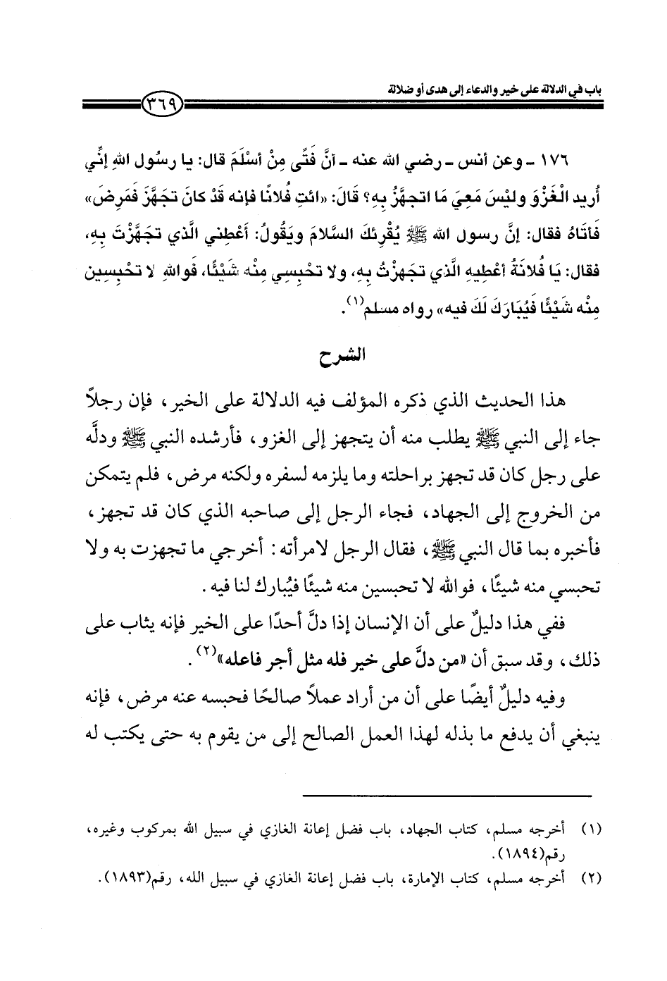 EXهذا الحديث الذي ذكره المؤلف فيه الدلالة على الخير، فإن رجلاً جاء إلى النبي صلى الله عليه وسم ليطلب منه أن يتجهز إلى الغزو، فأرشده النبي صلى الله عليه وسمل ودله على رجل كان قد تجهز براحلته وما يلزمه لسفره ولكنه مرض، فلم يتمكن من الخروج إلى الجهاد، فجاء الرجل إلى صاحبه الذي كان قد تجهز فأخبره بما قال النبي صلى الله عليه وسمل، فقال لامرأته: أخرجي ما تجهزت به ولا تحبسي منه شيئاً، فو الله لا تحبسين منه شيئاً فيُبارك لنا فيه.