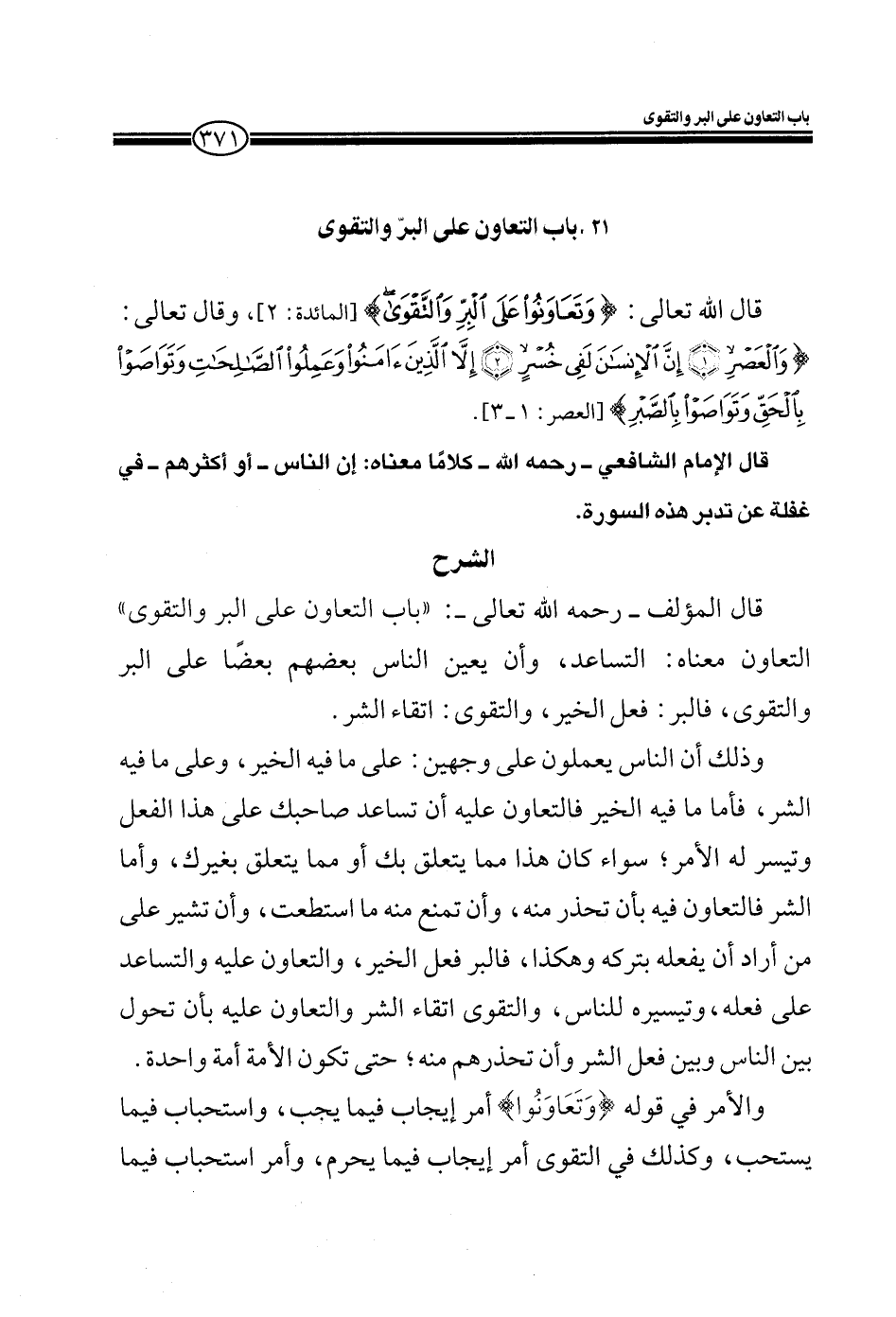 EXقال المؤلف رحمه الله تعالى-: "باب التعاون على البر والتقوى" التعاون معناه: التساعد، وأن يعين الناس بعضهم بعضاً على البر والتقوى فالبر: فعل الخير، والتقوى: اتقاء الشر وذلك أن الناس يعملون على وجهين: على ما فيه الخير، وعلى ما فيه الشر، فأما ما فيه الخير فالتعاون عليه أن تساعد صاحبك على هذا الفعل وتيسر له الأمر؛ سواء كان هذا مما يتعلق بك أو مما يتعلق بغيرك، وأما الشر فالتعاون فيه بأن تحذر منه، وأن تمنع منه ما استطعت، وأن تشير على من أراد أن يفعله بتركه وهكذا، فالبر فعل الخير، والتعاون عليه والتساعد على فعله، وتيسيره للناس، والتقوى اتقاء الشر والتعاون عليه بأن تحول بين الناس وبين فعل الشر وأن تحذرهم منه؛ حتى تكون الأمة أمة واحدة.