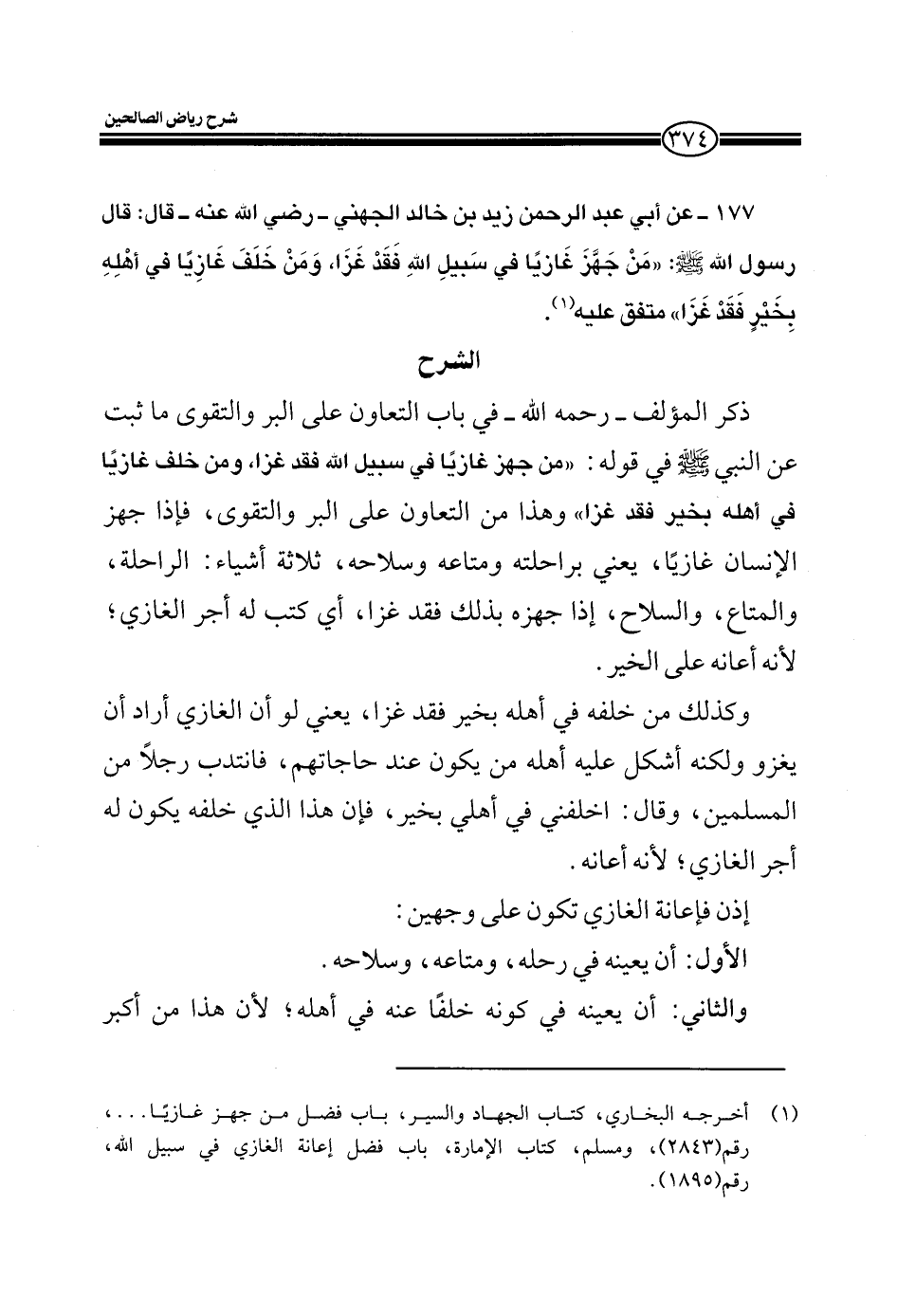 177- عن أبي عبد الرحمن زيد بن خالد الجهني- رضي الله عنه- قال: قال رسول الله صلى الله عليه وسلم: " من جهز غازياً في سبيل الله فقد غزا، ومن خلف غازياً في أهله بخيرٍ فقد غزا " متفق عليه.