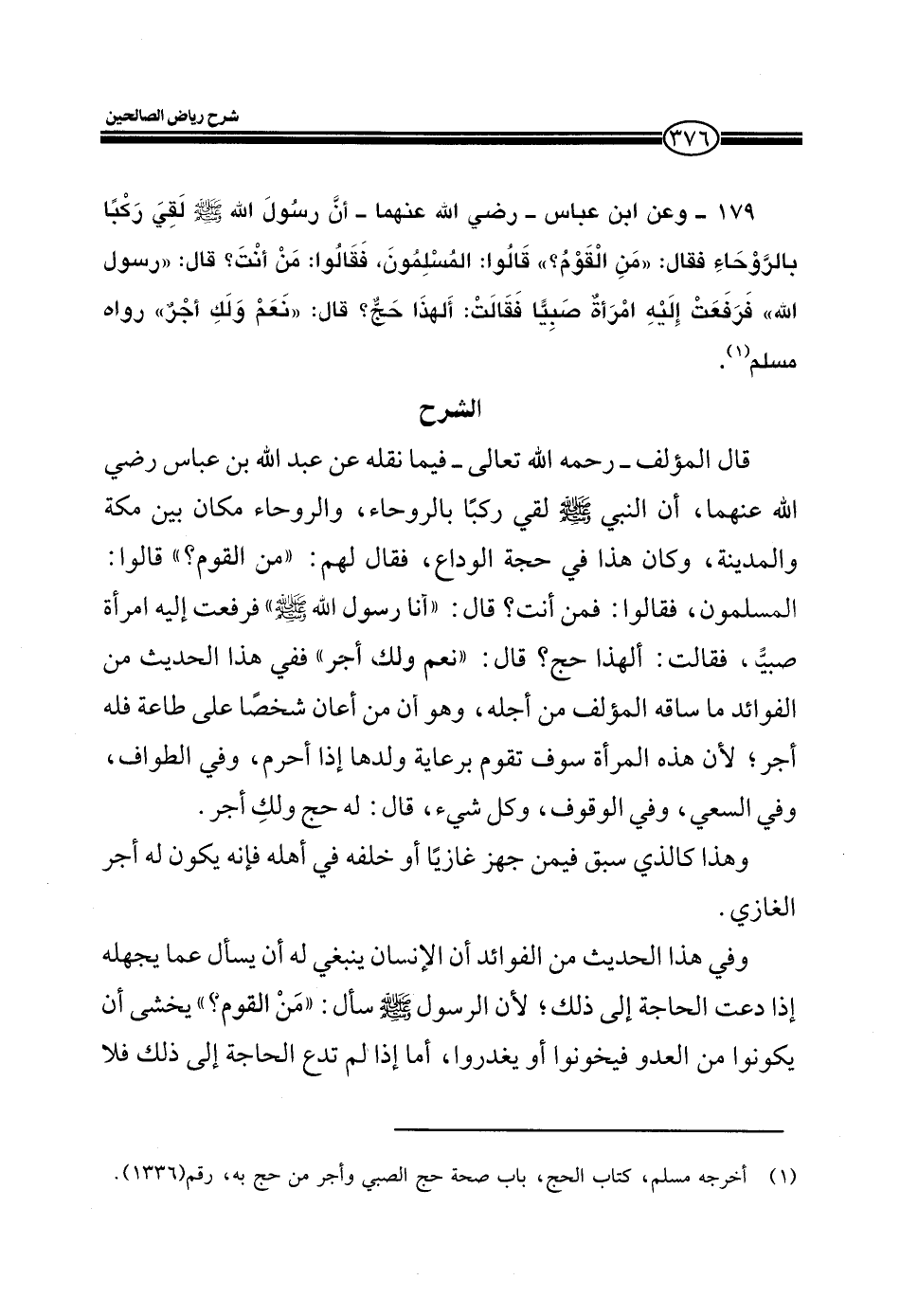 179- وعن ابن عباس - رضي الله عنهما- أن رسول الله صلى الله عليه وسلم لقي ركباً بالروحاء فقال (من القوم) " قالوا: المسلمون، فقالوا: من أنت؟ قال: " رسول الله" فرفعت إليه امرأةٌ صبياً فقالت: ألهذا حجٌ! قال: " نعم ولك أجرٌ" رواه مسلم.