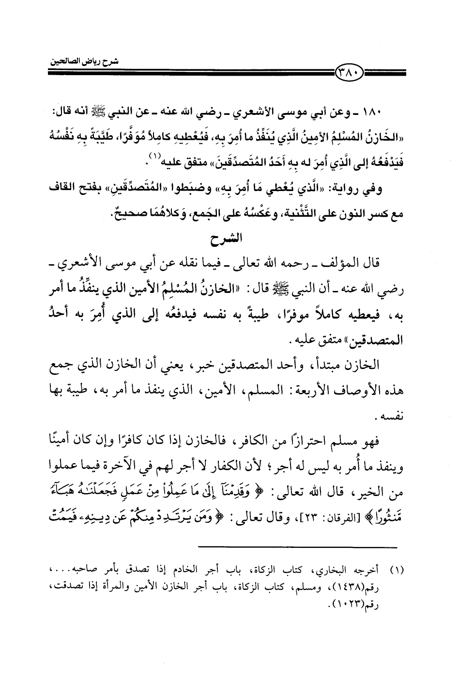180- وعن أبي موسى الأشعري - رضي الله عنه- عن النبي صلى الله عليه وسلم أنه قال " الخازن المسلم الأمينُ الذي ينفذ ما أمره به فيعطيه كاملاً موفرا، طيبة به نفسهُ فيدفعه إلى الذي أمر له به أحدُ المتصدقين" متفق عليه.