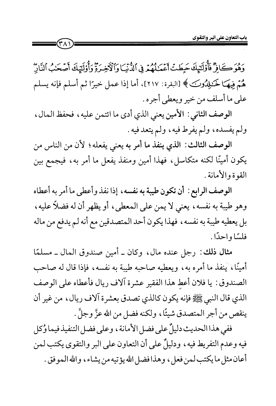 الوصف الرابع: أن تكون طيبة به نفسه، إذا نفذ وأعطى ما أمر به أعطاه وهو طيبة به نفسه، يعني لا يمن على المعطى، أو يظهر أن له فضلاً عليه بل يعطيه طيبة به نفسه، فهذا يكون أحد المتصدقين مع أنه لم يدفع من ماله فلساً واحداً.