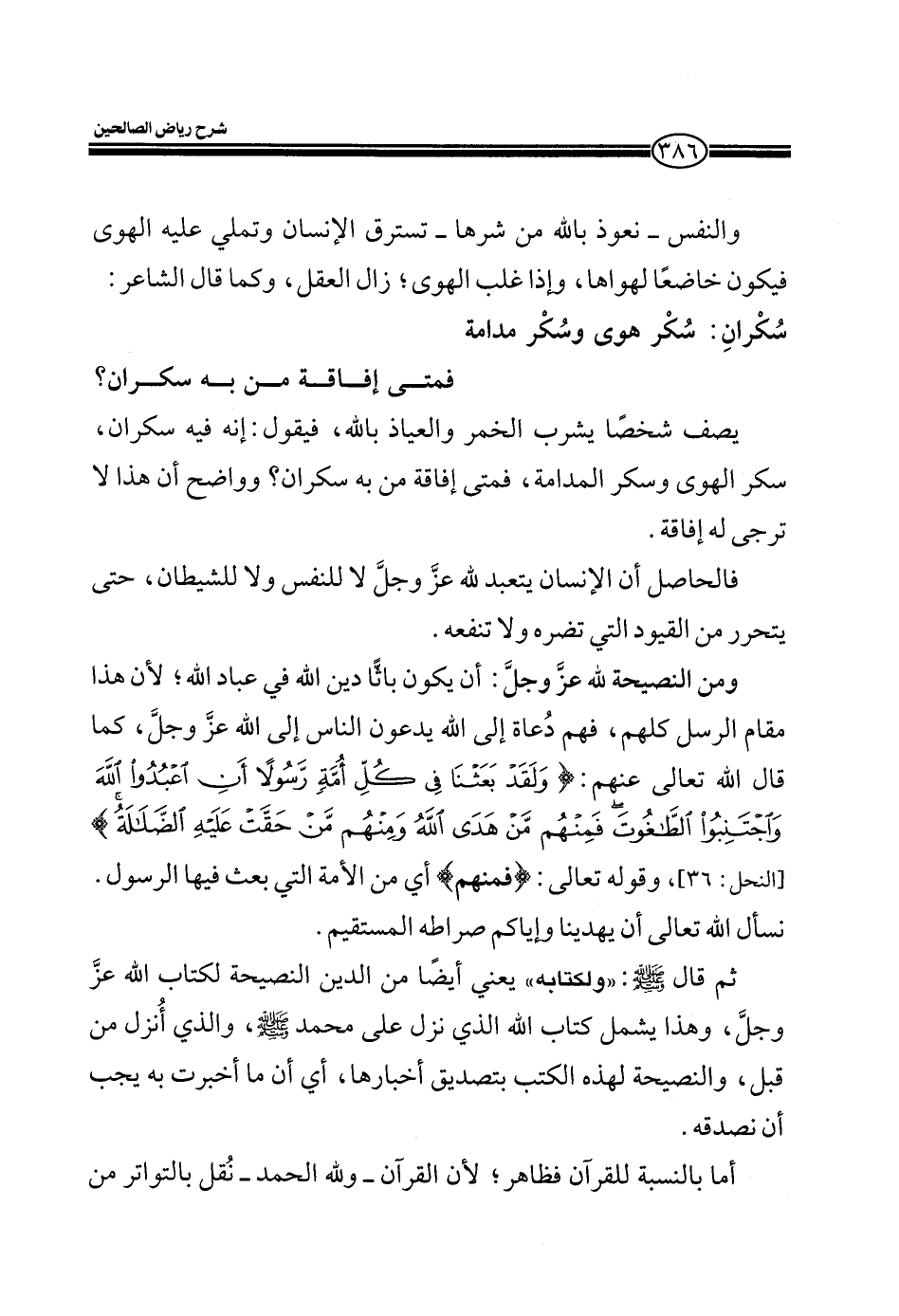 ومن النصيحة لله عزّ وجلّ: أن يكون باثاً دين الله في عباد الله؛ لأن هذا مقام الرسل كلهم، فهم دُعاة إلى الله يدعون الناس إلى الله عزّ وجلّ، كما قال الله تعالى عنهم: (وَلَقَدْ بَعَثْنَا فِي كُلِّ أُمَّةٍ رَسُولاً أَنِ اعْبُدُوا اللَّهَ وَاجْتَنِبُوا الطَّاغُوتَ فَمِنْهُمْ مَنْ هَدَى اللَّهُ وَمِنْهُمْ مَنْ حَقَّتْ عَلَيْهِ الضَّلالَةَُ) (النحل: 36) ، وقوله تعالى: (فَمِنْهُمْ) أي من الأمة التي بعث فيها الرسول. نسأل الله تعالى أن يهدينا وإياكم صراطه المستقيم.