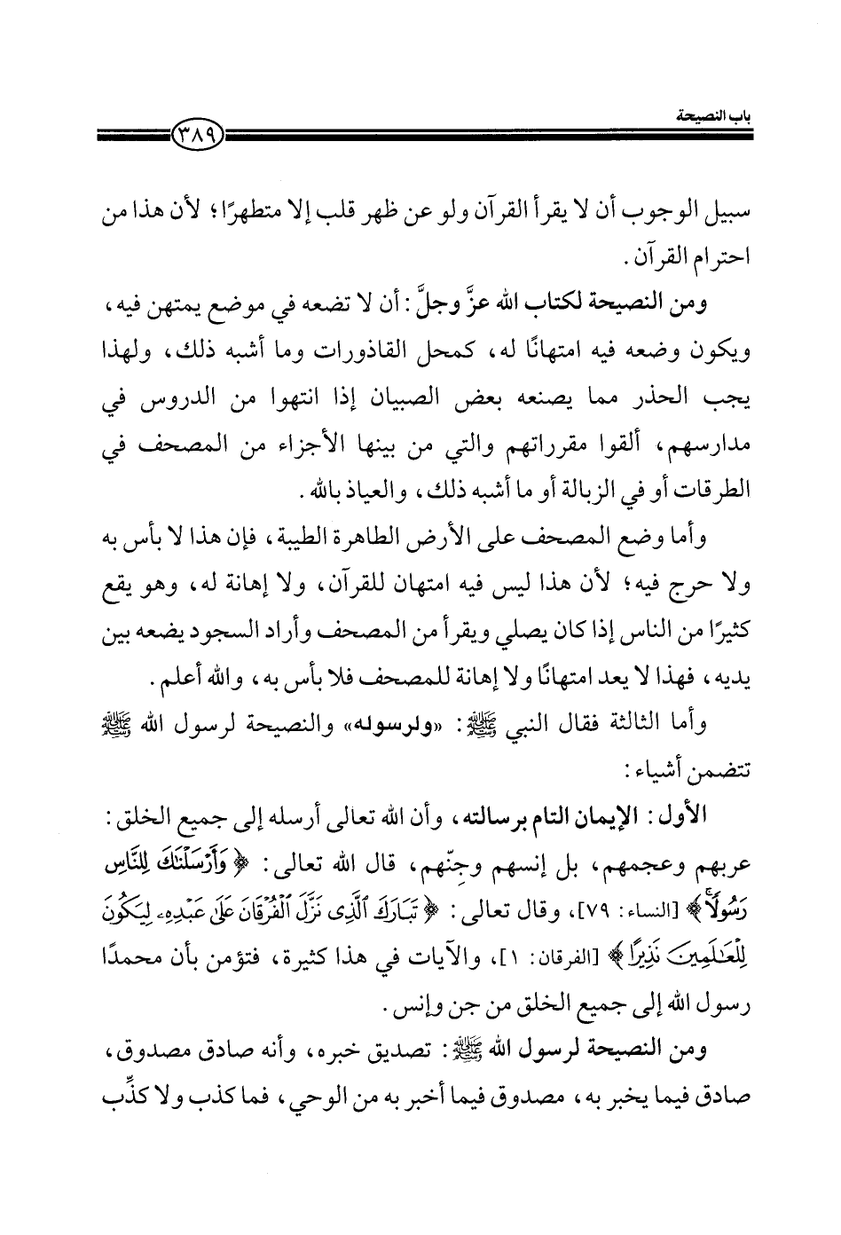 ومن النصيحة لكتاب الله عزّ وجلّ: أن لا تضعه في موضع يمتهن فيه، ويكون وضعه فيه امتهاناً له، كمحل القاذورات وما أشبه ذلك، ولهذا يجب الحذر مما يصنعه بعض الصبيان إذا انتهوا من الدروس في مدارسهم، ألقوا مقرراتهم والتي من بينها الأجزاء من المصحف في الطرقات أو في الزبالة أو ما أشبه ذلك، والعياذ بالله.