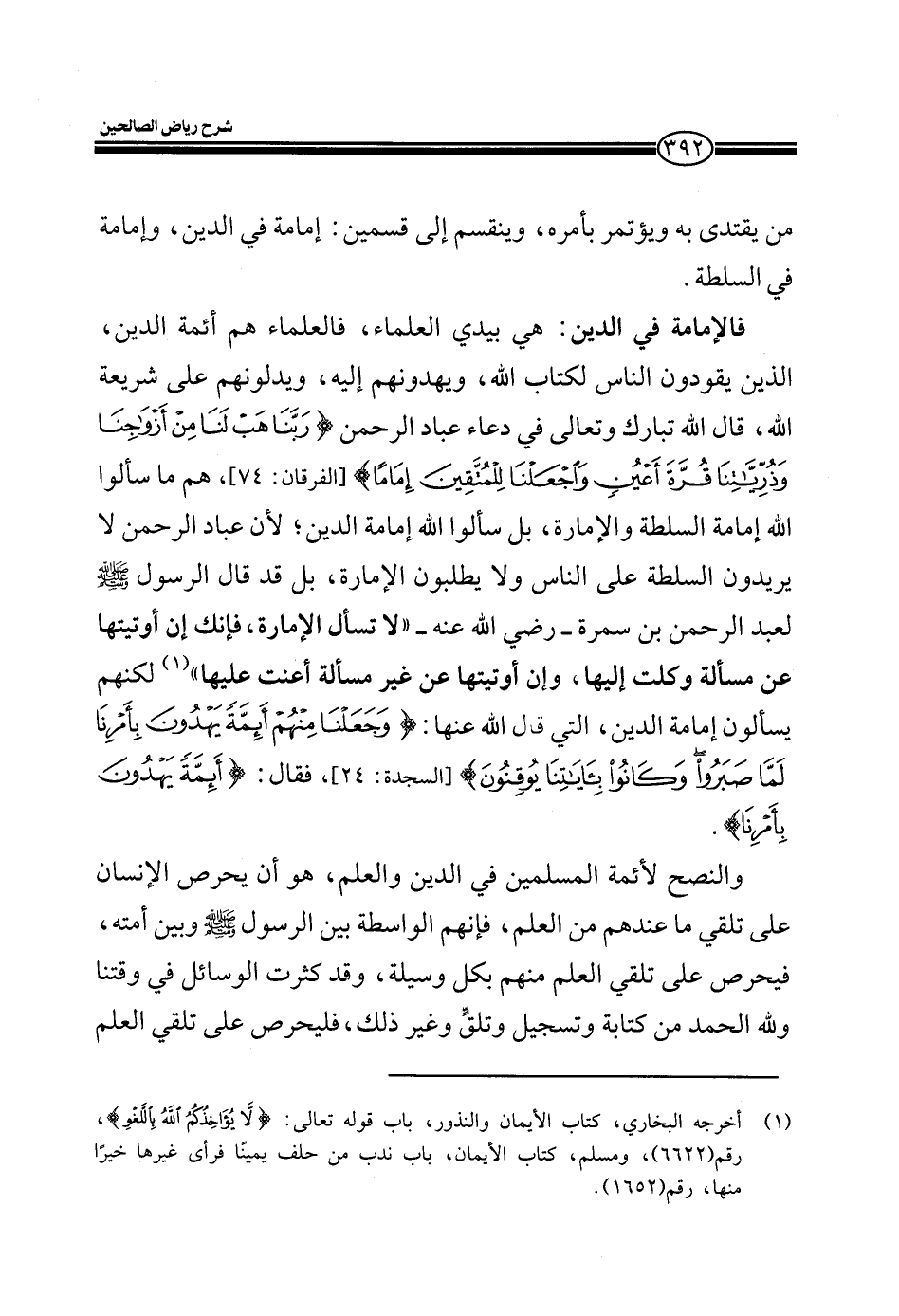 فالإمامة في الدين: هي بيدي العلماء، فالعلماء هم أئمة الدين الذين يقودون الناس لكتاب الله، ويهدونهم إليه، ويدلونهم على شريعة الله، قال الله تبارك وتعالى في دعاء عباد الرحمن (رَبَّنَا هَبْ لَنَا مِنْ أَزْوَاجِنَا وَذُرِّيَّاتِنَا قُرَّةَ أَعْيُنٍ وَاجْعَلْنَا لِلْمُتَّقِينَ إِمَاماً) (الفرقان: 74) ، هم ما سألوا الله إمامة السلطة والإمارة، بل سألوا الله إمامة الدين؛ لأن عباد الرحمن لا يريدون السلطة على الناس ولا يطلبون الإمارة، بل قد قال الرسول صلى الله عليه وسلم لعبد الرحمن بن سمرة- رضي الله عنه - " لا تسأل الإمارة، فإنك إن أوتيتها عن مسألة وكلت إليها، وإن أوتيتها عن غير مسألة أعنت عليها" لكنهم يسألون إمامة الدين، التي قالهم الله عنها: (وَجَعَلْنَا مِنْهُمْ أَئِمَّةً يَهْدُونَ بِأَمْرِنَا لَمَّا صَبَرُوا وَكَانُوا بِآياتِنَا يُوقِنُونَ) (السجدة: 24) فقال: (ائِمَّةً يَهْدُونَ بِأَمْرِنَا) .
