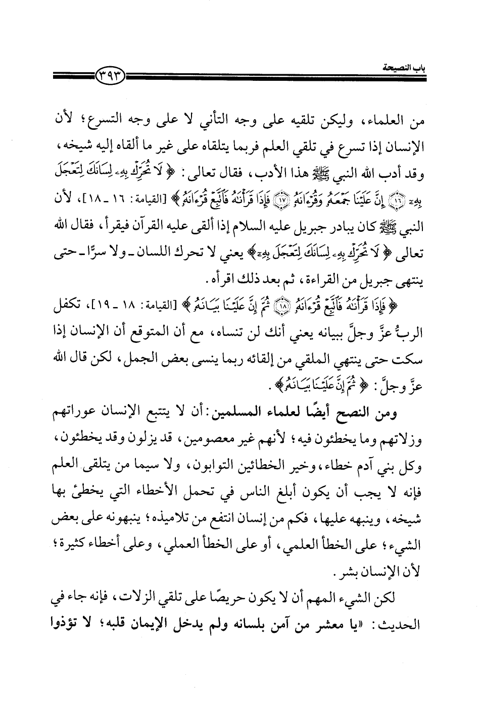 من العلماء، وليكن تلقيه على وجه التأني لا على وجه التسرع؛ لأن الإنسان إذا تسرع في تلقي العلم فربما يتلقاه على غير ما ألقاه إليه شيخه وقد أدب الله النبي صلى الله عليه وسلم هذا الأدب، فقال تعالى (لا تُحَرِّكْ بِهِ لِسَانَكَ لِتَعْجَلَ بِهِ) (إِنَّ عَلَيْنَا جَمْعَهُ وَقُرْآنَهُ) (فَإِذَا قَرَأْنَاهُ فَاتَّبِعْ قُرْآنَهُ) (القيامة: 16-19) ، لأن النبي صلى الله وعليه وسلم كان يبادر جبريل عليه السلام إذا ألقى عليه القرآن فيقرأ، فقال الله تعالى (لا تُحَرِّكْ بِهِ لِسَانَكَ لِتَعْجَلَ بِهِ) يعني لا تحرك اللسان- ولا سراً - حتى ينتهي جبريل من القراءة، ثم بعد ذلك اقرأه.