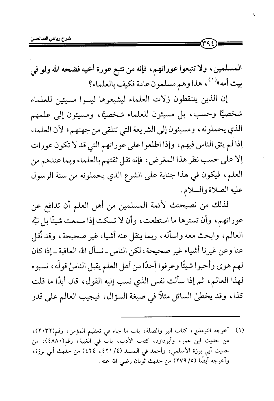 المسلمين ولا تتبعوا عوراتهم، فإنه من تتبع عورة أخيه فضحه الله ولو في بيت أمه"، هذا وهم مسلمون عمامة فيكف بالعلماء.