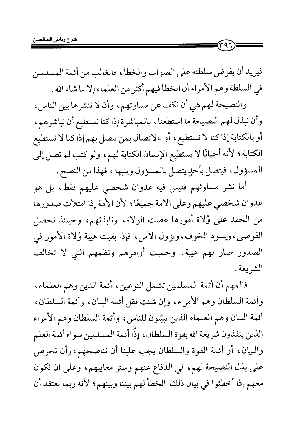 فالمهم أن أئمة المسلمين تشمل النوعين، أئمة الدين وهم العلماء، وأئمة السلطان وهم الأمراء، وإن شئت فقل أئمة البيان، وأئمة السلطان، وأئمة البيان وهم العلماء الذين يبيّنون للناس، وأئمة السطان وهم الأمراء الذين ينفذون شريعة الله بقوة السلطان، إذاً أئمة المسلمين سواء أئمة العلم والبيان، أو أئمة القوة والسلطان يجب علينا أن نناصحهم، وأن نحرص على بذل النصيحة لهم، في الدفاع عنهم وستر معايبهم، وعلى أن نكون معهم إذا أخطئوا في بيان ذلك الخطأ لهم بيننا وبينهم؛ لأنه ربما نعتقد أن