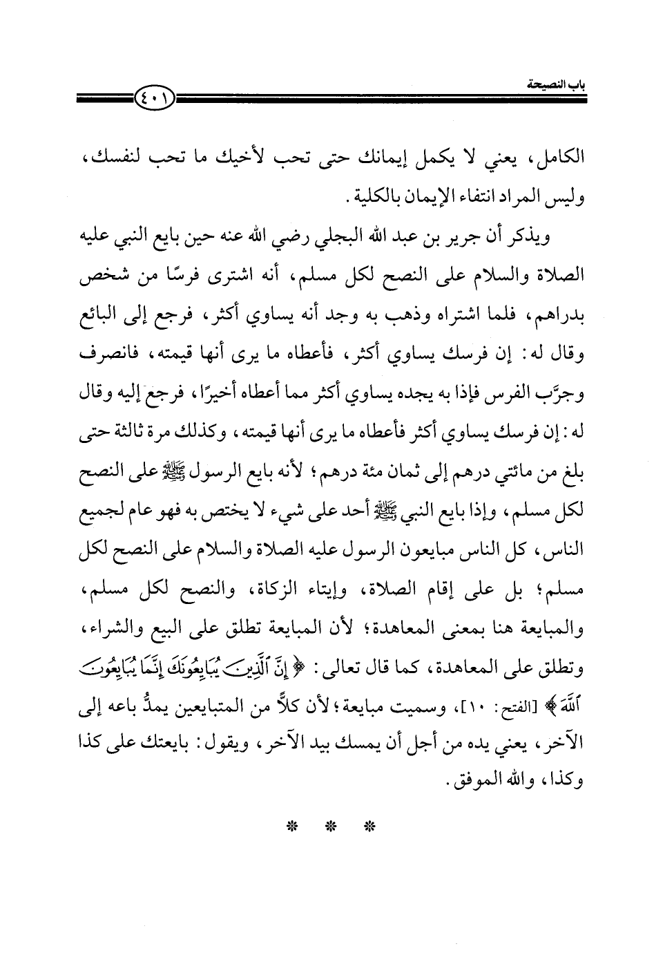 ويذكر أن جرير بن عبد الله البجلي رضي الله عنه حين بايع النبي عليه الصلاة والسلام على النصح لكل مسلم، أنه اشترى فرساً من شخص بدراهم، فلما اشتراه وذهب به وجد أنه يساوي أكثر، فرجع إلى البائع وقال له: إن فرسك يساوي أكثر، فأعطاه ما يرى أنها قيمته، فانصرف وجرّب الفرس فإذا به يجده يساوي أكثر مما أعطاه أخيراً، فرجع إليه وقال له: إن فرسك يساوي أكثر فأعطاه ما يرى أنها قيمته، وكذلك مرة ثالثة حتى بلغ من مائتي درهم إلى ثمان مائة درهم؛ لأنه بايع الرسول صلى الله عليه وسمل على النصح لكل مسلم، وإذا بايع النبي صلى الله عليه وسلم أحد على شيء لا يختص به فهو عام لجميع الناس، كل الناس مبايعون الرسول عليه الصلاة والسلام على النصح لكل مسلم؛ بل على إقام الصلاة، وإيتاء الزكاة، والنصح لكل مسلم، والمبايعة هنا بمعنى المعاهدة؛ لأن المبايعة تطلق على البيع والشراء، وتطلق على المعاهدة تطلق على البيع والشراء، وتطلق على المعاهدة، كما قال تعالى (إِنَّ الَّذِينَ يُبَايِعُونَكَ إِنَّمَا يُبَايِعُونَ اللَّهَ) (الفتح: 10) ، وسميت مبايعة؛ أن كلاًّ من المتبايعين يمدُ باعه إلى الآخر، يعني يده من أجل أن يمسك بيد الآخر، ويقول: