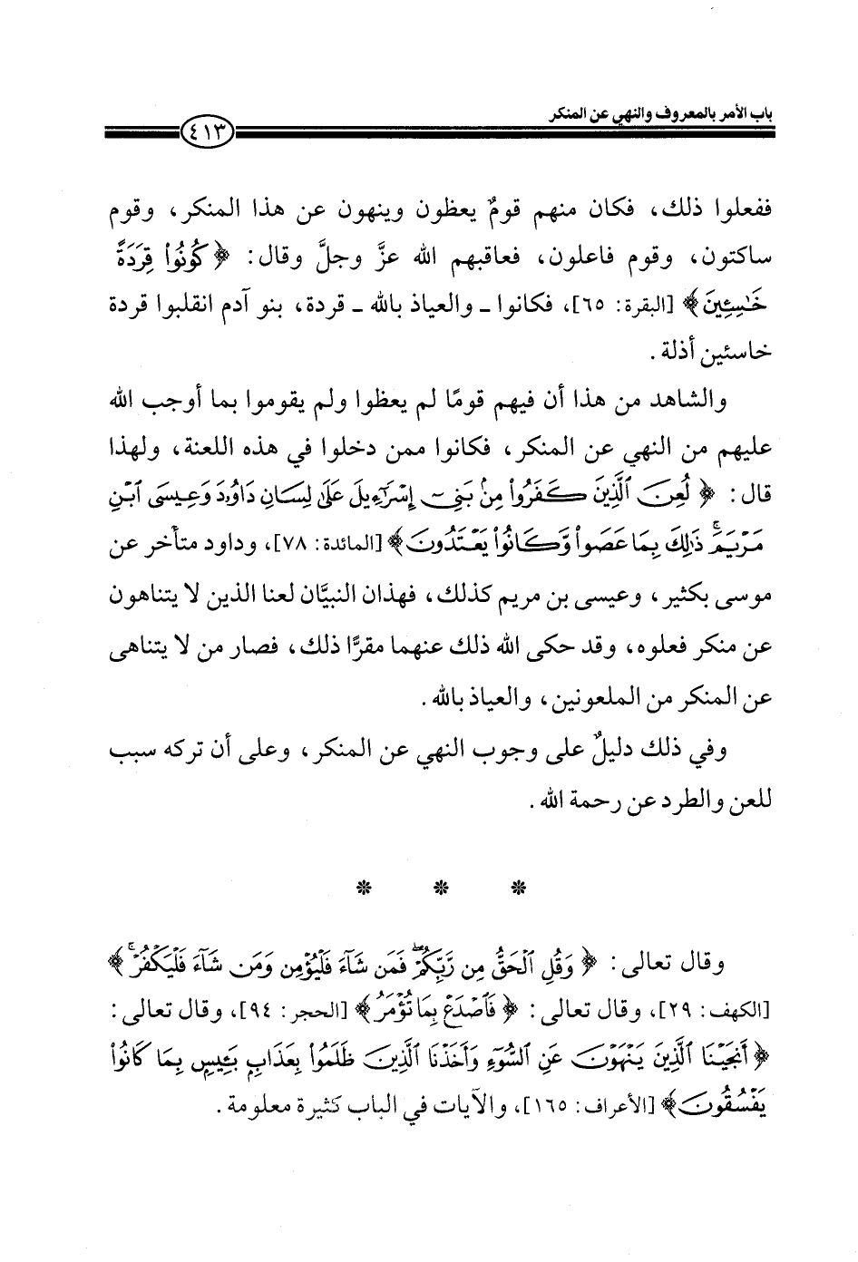 والشاهد من هذا أن فيهم قوماً لم يعطموا ولم يقوموا بما أوجب الله عليهم من النهي عن المنكر، فكانوا ممن دخلوا في هذه اللعنة، ولهذا قال) (لُعِنَ الَّذِينَ كَفَرُوا مِنْ بَنِي إِسْرائيلَ عَلَى لِسَانِ دَاوُدَ وَعِيسَى ابْنِ مَرْيَمَ ذَلِكَ بِمَا عَصَوْا وَكَانُوا يَعْتَدُونَ) (المائدة: 78) ، وداود متأخر عن موسى بكثيرة وعيسي بن مريم كذلك، فهذان النسيان الذين لا يتناهون عن منكر فعلوه، وقد حكى الله ذلك عنهما مقراً ذلك، فصار من لا يتناهى عن المنكر من الملعونين، والعياذ بالله.