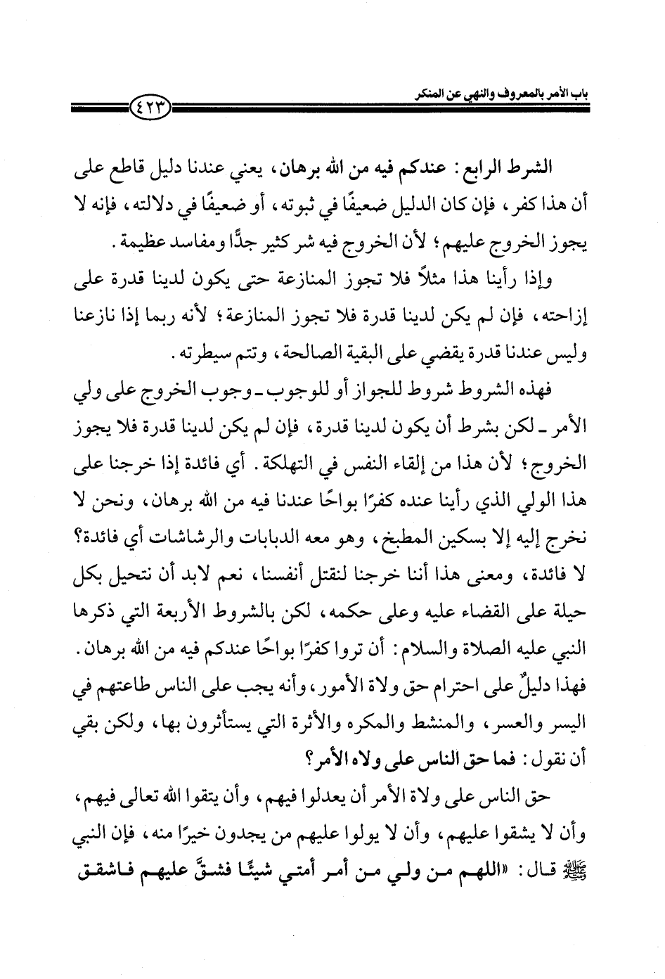 الشرط الرابع: عندكم فيه من الله برهان، يعني عندنا دليل قاطع على أن هذا كفر، فإن كان الدليل ضعيفاً في ثبوته، أو ضعيفاً في دلالته، فإنه لا يجوز الخروج عليهم؛ لأن الخروج فيه شر كثير جداً ومفاسد عظيمة.
