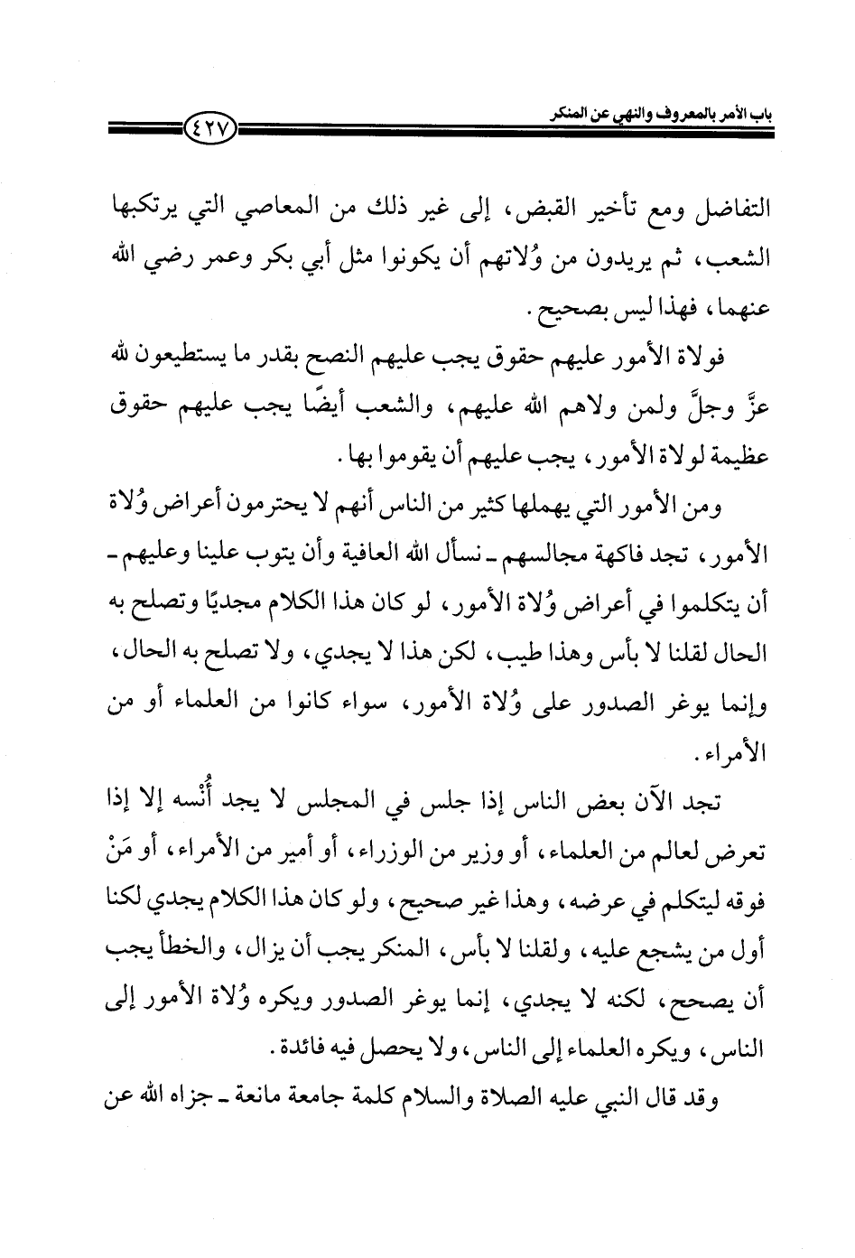 ومن الأمور التي يهملها كثير من الناس انهم لا يحترمون أعراض وُلاة الأمور، تجد فاكهة مجالسهم - نسأل اله العافية وأن يتوب علينا وعليهم - أن يتكلموا في أعراض وُلاة الأمور، ولو كان هذا الكلام مجدياً وتصلح به الحال لقنا لا بأس وهذا طيب، لكن هذا لا يجدي، ولا تصلح به الحال، وإنما يوغر الصدور على وُلاة الأمور، سواء كانوا من العلماء أو من الأمراء.
