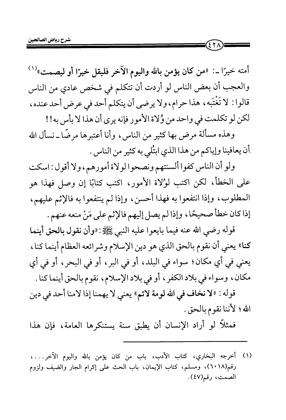أمته خيراً-: " من كان يؤمن بالله واليوم الآخر فليقل خيراً أو ليصمت" والعجب أن بعض الناس لو أردت أن تتكلم في شخص عادي من الناس قالوا: لا تغتبه، هذا حرام، ولا يرضى أن يتكلم أحد في عرض أحد عنده، لكن لو تكلمت في واحد من وُلاة الأمور فإنه يرى أن هذا لا بأس به!!