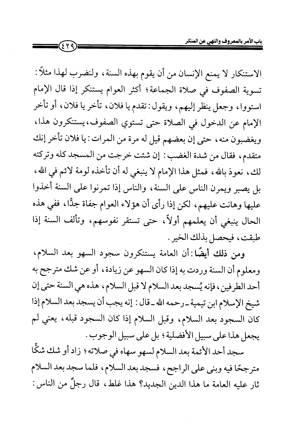 ومن ذلك أيضاً: أن العامة يستنكرون سجود السهو بعد السلام، ومعلوم أن السنة وردت به إذا كان السهو عن زيادة، أو عن شك مترجح به أحد الطرفين، فإنه يُسجد بعد السلام لا قبل السلام، هذه هي السنة حتى إن شيخ الإسلام ابن تيميه- رحمه الله- قال: إنه يجب أن يسجد بعد السلام إذا كان السجود بعد السلام، وقبل السلام إذا كان السجود قبله، يعني لم يجعل هذا على سبيل الأفضلية؛ بل على سبيل الوجوب.