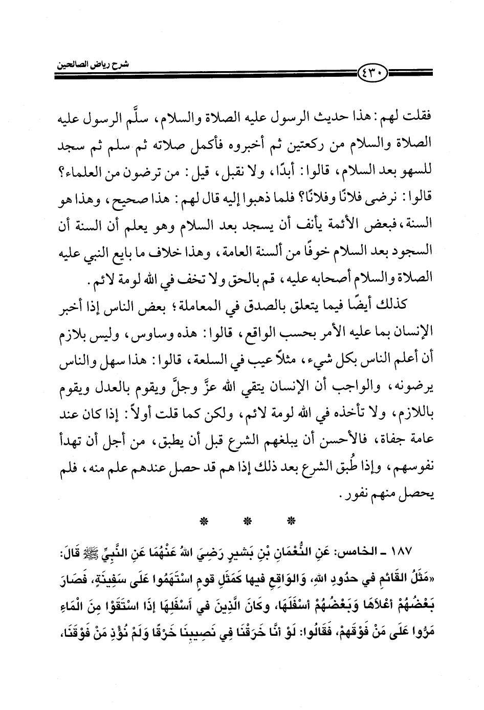 187- الخامس عن النعمان بن بشيرٍ رضي الله عنهما عن النبي صلى الله لعيه وسلم قال: " مثل القائم في حدود الله، والواقع فيها كمثل قومٍ استهموا على سفينة، فصار بعضهم أعلاها وبعضهم أسفلها، وكان الذين في أسفها إذا استقوا من الماء مروا على من فوقهم فقالوا: لو أنا خرقنا في نصيبنا خرقاً ولم نؤذ من فوقنا،