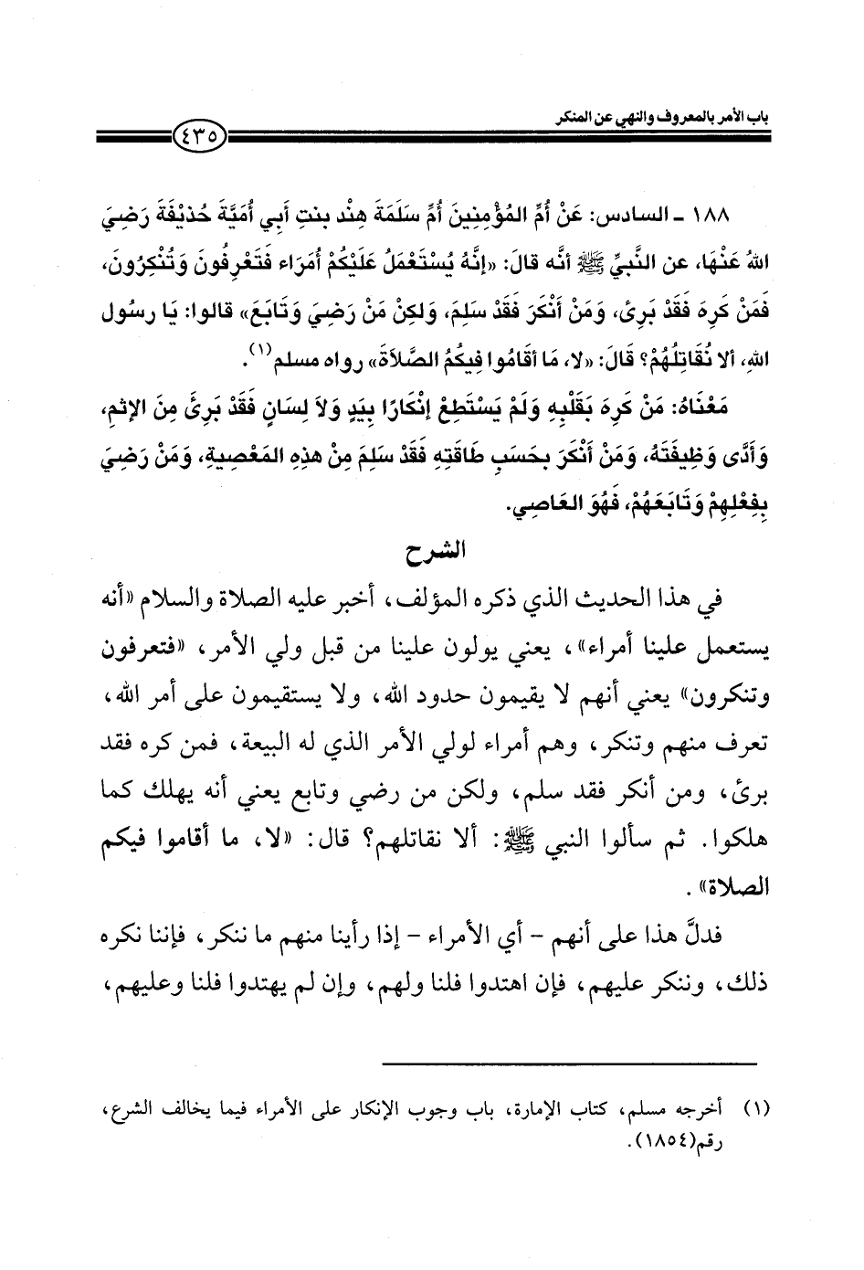 188-السادس: عن أم المؤمنين أم سلمة هند بنت أبي أمية حذيفة رضية الله عنهما، عن النبي صلى الله عليه وسلم أنه قال: " إنه يستعمل عليكم أمراء فتعرفون وتنكرون، فمن كره فقد برى، ومن أنكر فقد سلم، ولكن من رضي وتابع" قالوا: يا رسول الله، ألا نقاتلهم؟ قال: " لا، ما أقاموا فيكم الصلاة" رواه مسلم.