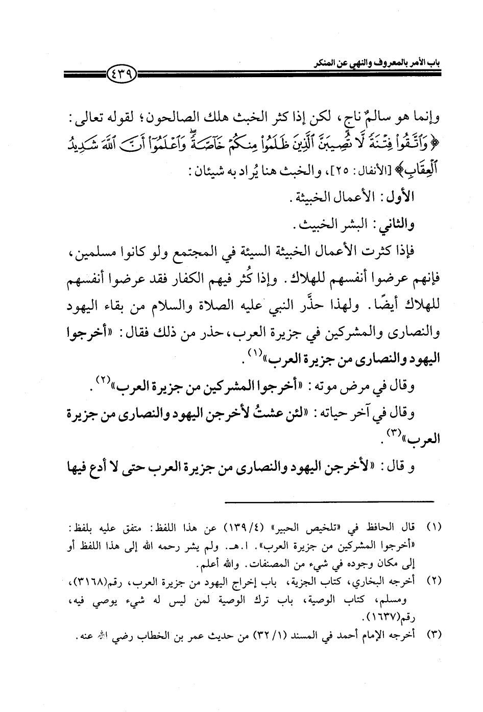 فإذا كثرت الأعمال الخبيثة السيئ في المجتمع ولو كانوا مسلمين، فإنهم عرضوا أنفسهم للهلاك. وإذا كُثر فيه الكفار فقد عرضوا أنفسهم للهلاك أيضاً. ولهذا حذّر النبي عليه الصلاة والسلام من بقاء اليهود والنصارى والمشركين في جزيرة العرب، حذر من ذلك فقال: " أخرجوا اليهود والنصارى من جزيرة العرب"