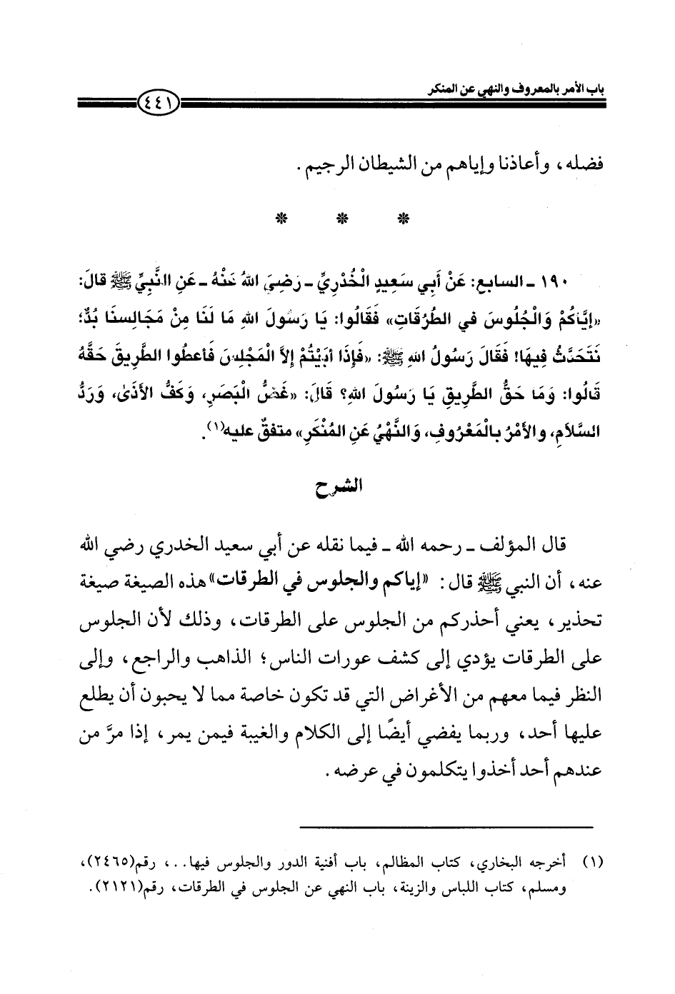 190- السابع: عن أبي سعيد الخدري- رضي الله عنه- عن النبي صلى الله عليه وسلم قال" إياكم والجلوس في الطرقاتِ" فقالوا: يا رسول الله ما لنا من مجالسنا بدٌ؛ نتحدث فيهاّ! فقال رسول اله صلى الله عليه وسلم: " فإذا أبيتم إلا المجلس فأعطوا الطريق حقه قالوا: وما حقٌ الطريق يا رسول الله قال: " غضٌ البصر، وكف الأذى، وردُّ السلام والأمر بالمعروف، والنهي عن المنكرِ" متفقٌ عليه.