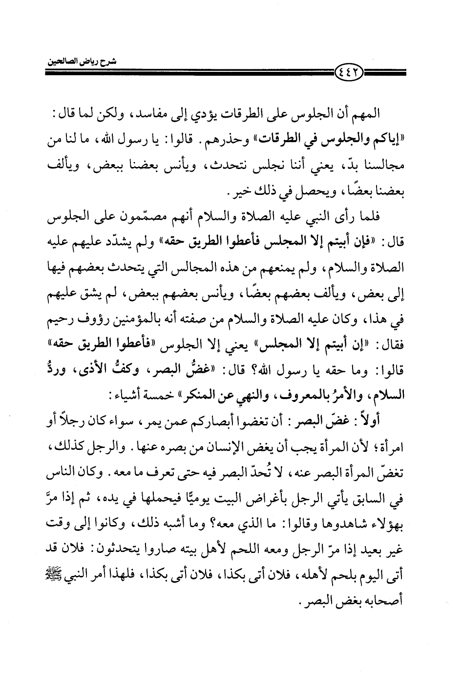 فلما رأى النبي عليه الصلاة والسلام أنهم مصّممون على الجلوس قال: " فإن أبيتم إلا المجلس فأعطوا الطريق حقه" ولم يشدّد عليهم عليه الصلاة والسلام، ولم يمنعهم من هذه المجالس التي يتحدث بعضهم فيها إلى بعض، ويألف بعضهم بعضاً، ويأنس بعضهم ببعض، ولم يشق عليهم في هذا، وكان عليه الصلاة والسلام من صفته أنه بالمؤمنين رؤوف رحيم فقال: " إن أبيتم إلا المجلس" يعني إلا الجلوس " فاعطوا الطريق حقه " قالوا: وما حقه يا رسول الله؟ قال " غض البصر، وكفٌ الأذى، وردُ السلام، والأمرُ بالمعروف، والنهي عن المنكر" خمسة أشياء: