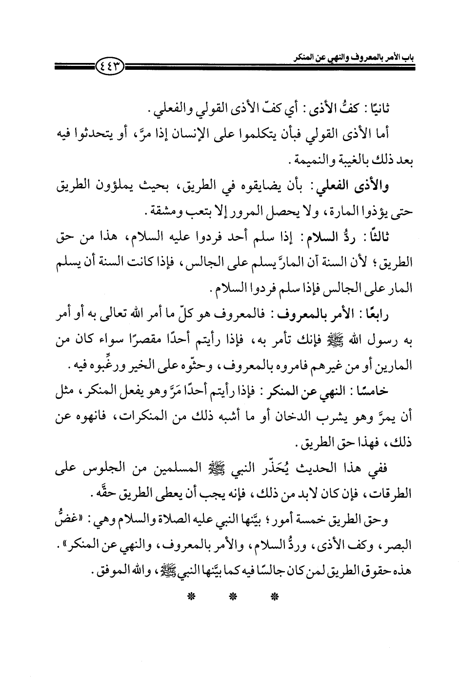 وحق الطريق خمسة أمور؛ بينها النبي عليه الصلاة والسلام وهي: " غضُّ البصر، وكف الأذى، وردُ السلام، والأمر بالمعروف، والنهي عن المنكر ". هذه حقوق الطريق لمن كان جالساً فيه كما بينها النبي صلى الله عليه وسلم، والله الموفق.