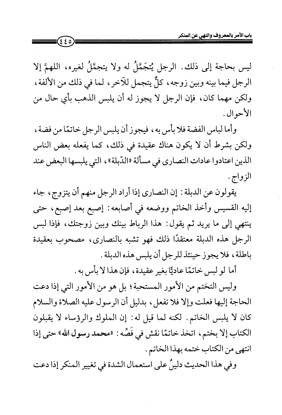 وليس التختم من الأمور المستحبة؛ بل هو من الأمور التي إذا دعت الحاجة إليها فعلت وإلا فلا تفعل، بدليل أن الرسول عليه الصلاة والسلام كان لا يلبس الخاتم لكنه لما قيل له: إن الملوك والرؤساء لا يقبلون الكتاب إلا بختم، اتخذ خاتماً نقش في فصِّه: " محمد رسول الله " حتى إذا انتهى من الكتاب ختمه بهذا الخاتم.