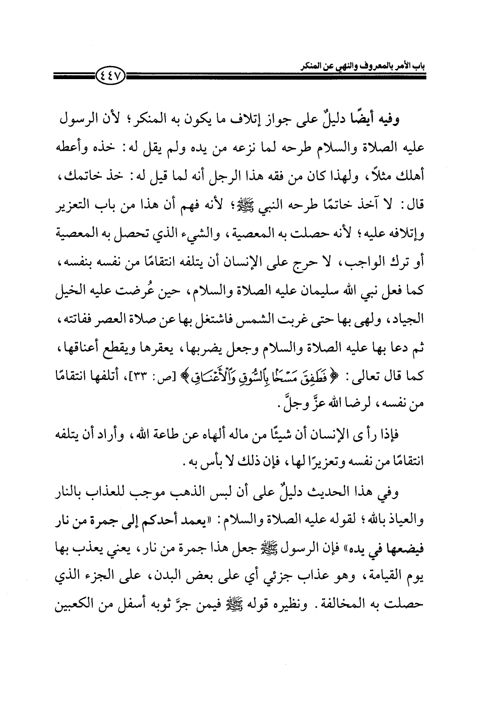 وفيه أيضاً دليلٌ على جواز إتلاف ما يكون به المنكر؛ لأن الرسول عليه الصلاة والسلام طرحه لما نزعه من يده ولم يقل له: خذه وأعطه أهلك مثلاً، ولهذا كان من فقه هذا الرجل أنه لما قيل له: خذ خاتمك، قال: لا آخذ خاتماً طرحه النبي صلى الله عليه وسلم؛ لأنه فهم أن هذا من باب التعزيز وإتلافه عليه؛ لأنه حصلت به المعصية، والشيء الذي تحصل به المعصية أو ترك الواجب، لا حرج على الإنسان أن يتلفه انتقاماً من نفسه بنفسه، كما فعل نبي الله سليمان عليه الصلاة والسلام، حين عُرضت عليه الخيل الجياد، ولهى بها حتى غربت الشمس فاشتغل بها عن صلاة العصر ففاتته، ثم دعا بها عليه الصلاة والسلام وجعل يضربها، يعقرها ويقطع أعناقها، كما قال تعالى: (فَطَفِقَ مَسْحاً بِالسُّوقِ وَالْأَعْنَاقِ) (صّ: 33) ، أتلقها انتقاماً من نفسه، لرضا الله عزّ وجلّ.