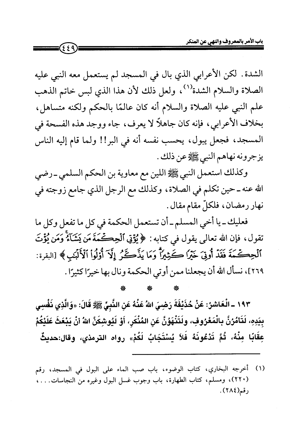 193- العاشر: عن حذيفة رضي الله عنهُ عن النبي صلى الله عليه وسلم قال: " والذي نفسي بيده، لتأمرون بالمعروف، ولتنهون عن المنكر، أو ليوشكن الله أن يبعث عليكم عقاباً منه، ثم تدعونه فلا يستجابُ لكم" رواه الترمذي، وقال: حديثٌ